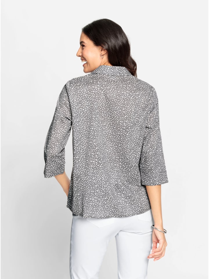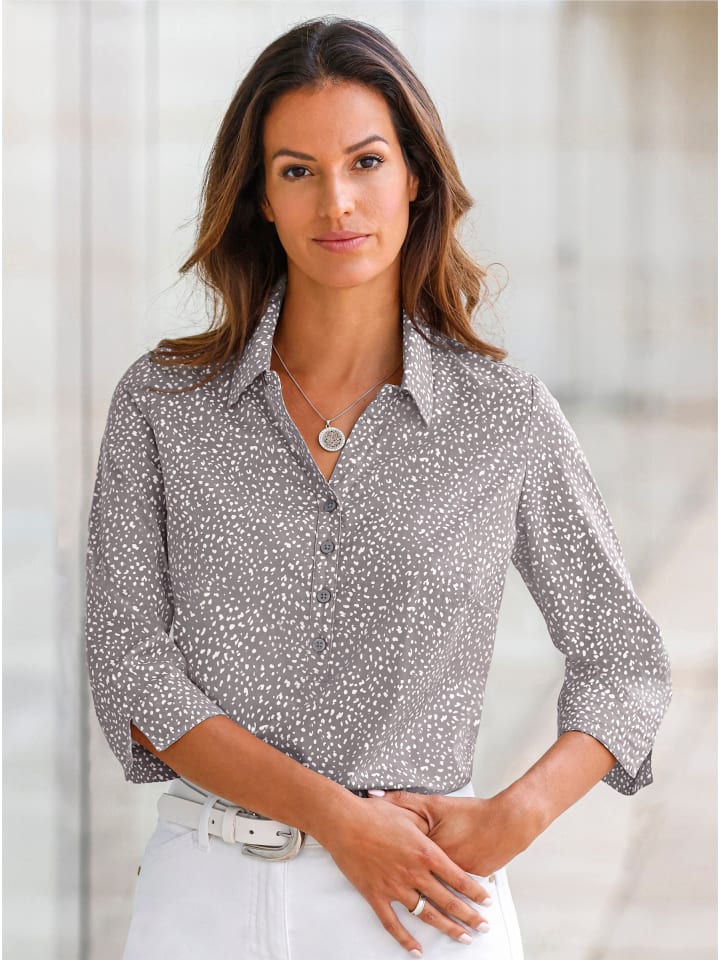 Кто сказал, что горошек обязательно должен быть круглым? Эта блузка доказывает обратное, покоряя своим удобным фасоном, открытым воротником, короткой планкой на пуговицах, утягивающими вытачками на груди и рукавами ¾ с разрезами на манжетах. Поддерживает инициативу «Хлопок, сделанный в Африке».