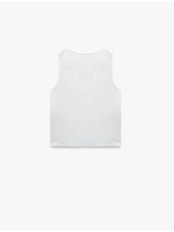 Эта стильная блузка без рукавов сочетает в себе классический шарм с современными акцентами. V-образный вырез создает элегантный силуэт, а металлические аксессуары создают уникальный модный акцент. Идеально подходит для повседневного офисного ношения или повседневных нарядов, добавляя изысканный штрих любому образу.