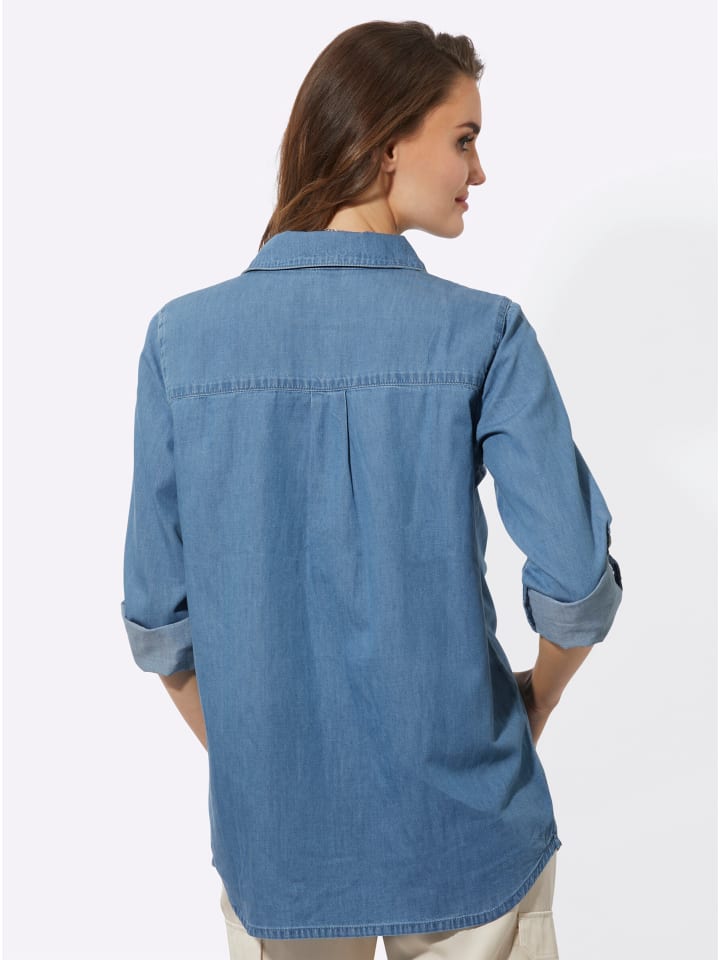 Эта длинная блузка сочетает в себе модный джинсовый стиль и множество модных деталей: рубашечный воротник и планка с блестящими пуговицами. Накладной нагрудный карман украшен блестящей нашивкой и аппликацией «Just Wow». Длинные рукава с манжетами на пуговицах можно подвернуть. Привлекательный крой включает в себя расширяющуюся складку на кокетке сзади и закругленный низ. Модель соответствует инициативе «Хлопок, сделанный в Африке».