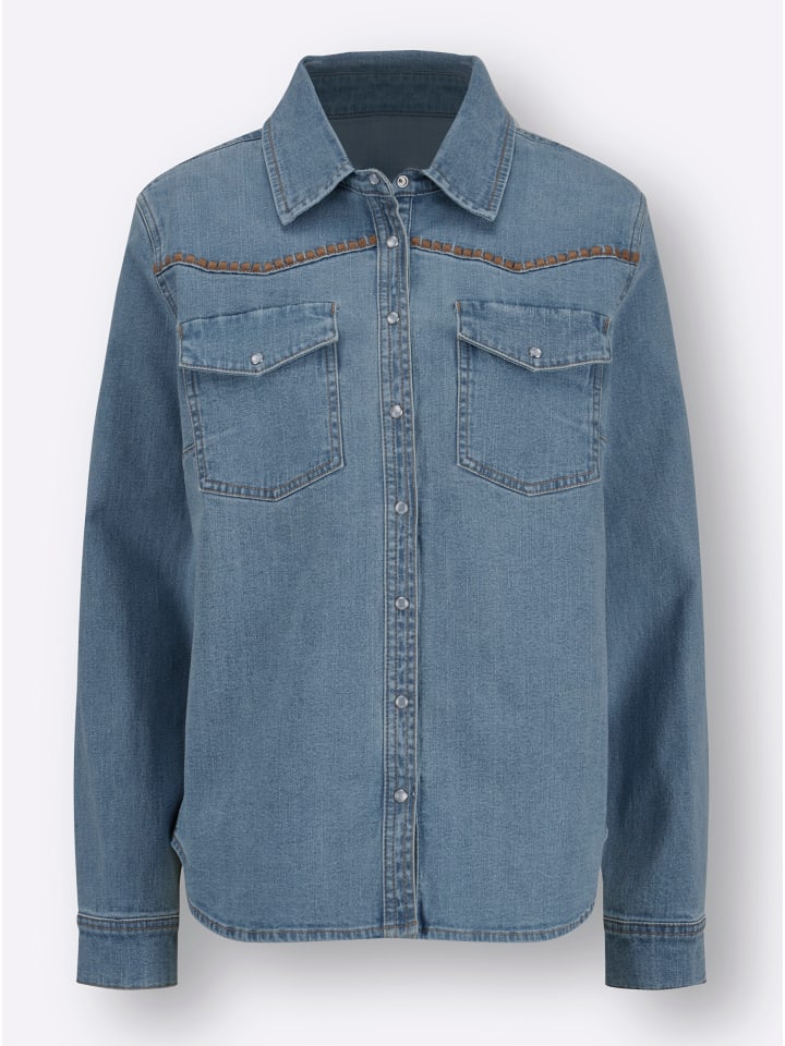 Эта модная вещь - must-have для любого гардероба! Джинсовая блузка с фантастическими деталями. Особенности: рубашечный воротник с дополнительной стойкой и кнопками, длинная планка с кнопками и перламутровыми пуговицами, длинные рукава с манжетами, разрез и две кнопки, два накладных нагрудных кармана с клапанами и кнопками, детали из искусственной кожи и закругленный подол. Контрастная вышивка на кокетке добавляет нотку стиля. Поддерживает инициативу «Сделано в Африке» из хлопка.