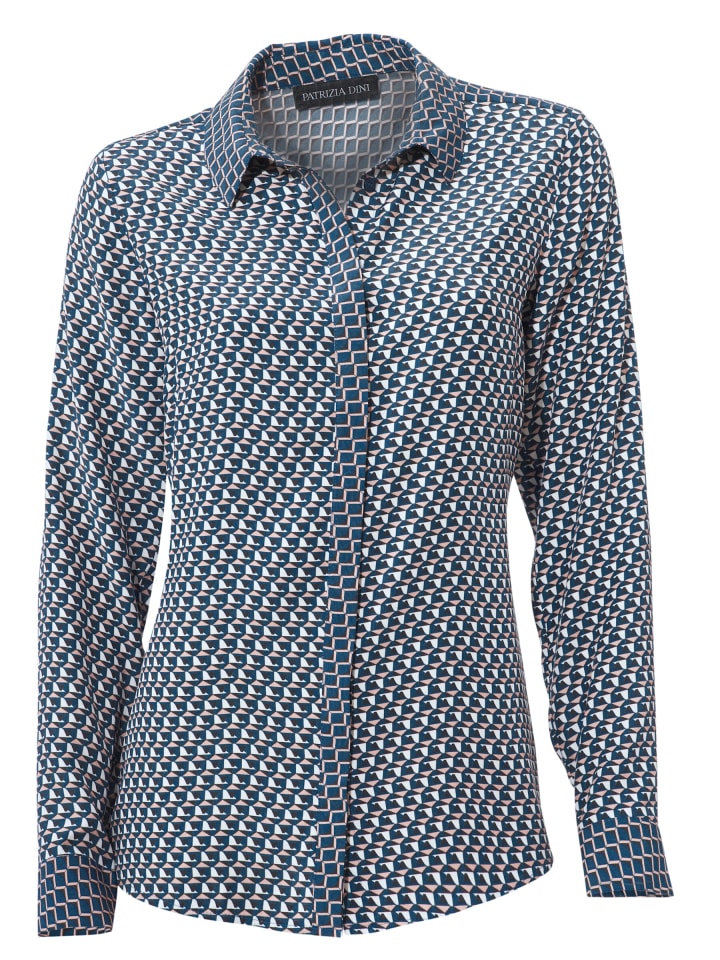 Блузка с графическим принтом и лоскутным узором. Приятный материал. Комфортный крой. Женственный стиль на все случаи жизни. Длинные рукава.