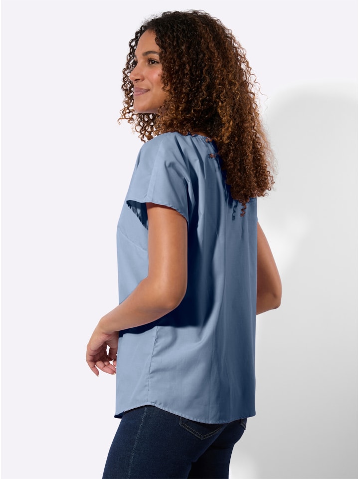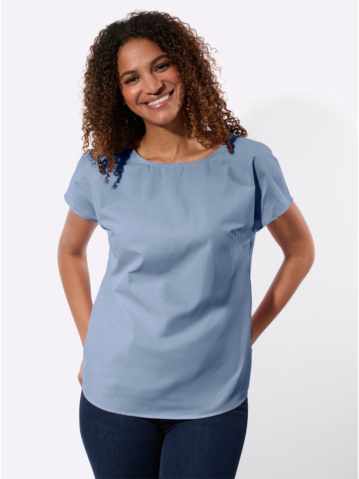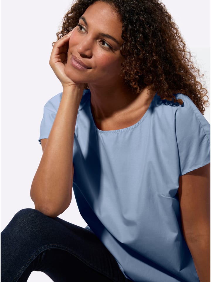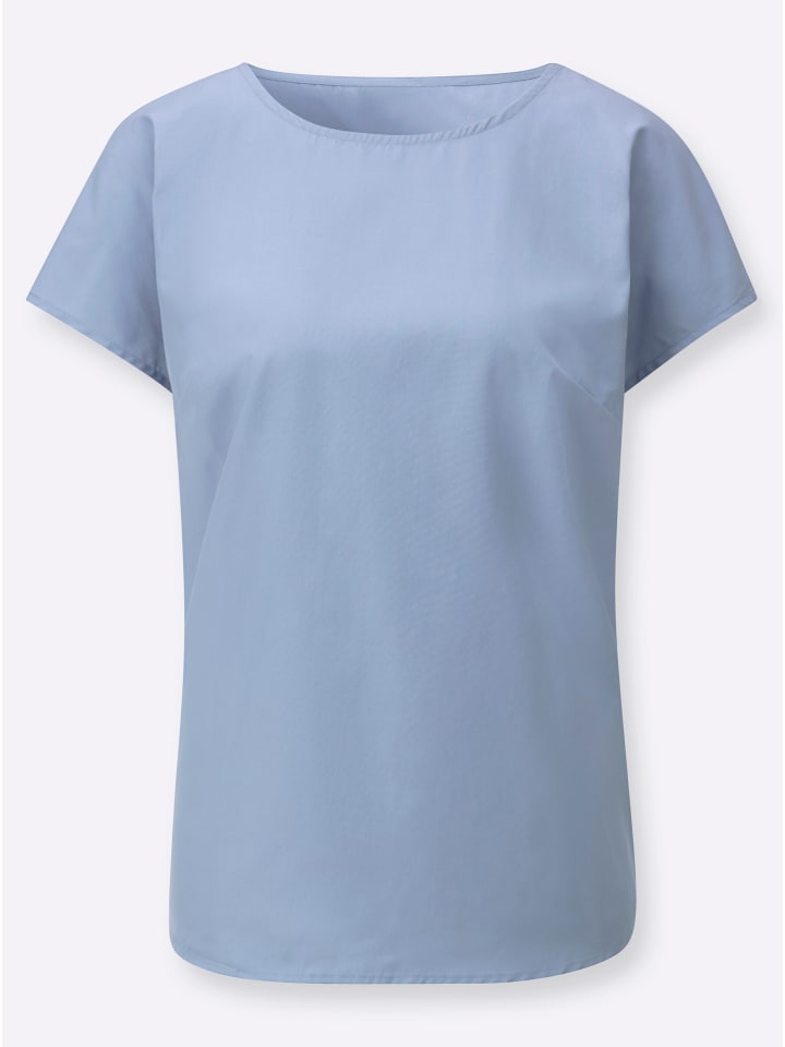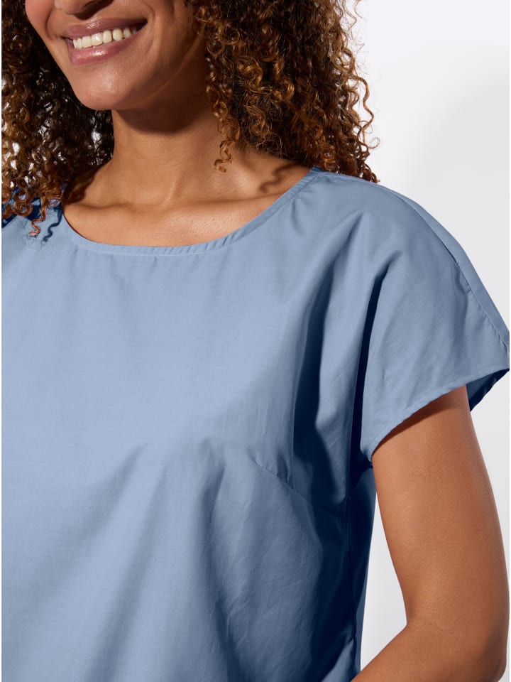 Изысканная простота: блузка без застежки с модной спущенной линией плеча и корректирующими вытачками на груди. Слегка закругленный низ. Поддерживает инициативу «Хлопок, сделанный в Африке».