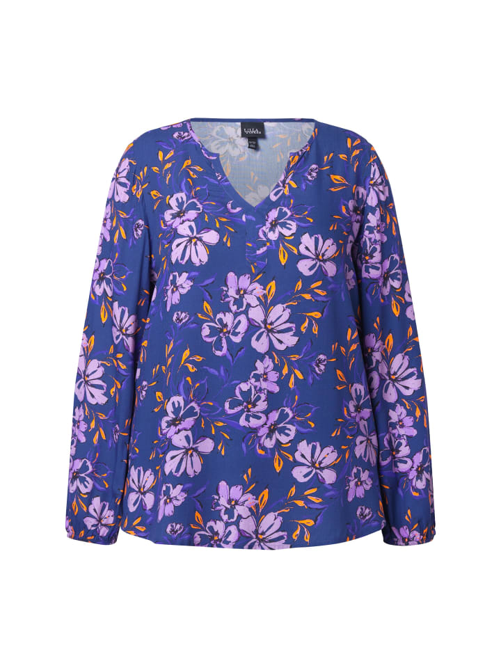 Блузка А-силуэта из мягкой вискозы с цветочным узором. V-образный вырез, длинные рукава с эластичными манжетами. Удлиненный подол сзади с боковыми разрезами для дополнительного комфорта.