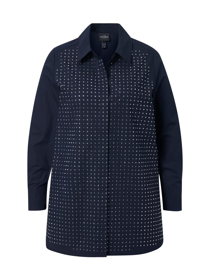 Блузка А-силуэта из мягкого хлопка. Изюминкой являются элегантные украшения из стразов спереди. Отложной воротник, потайная застежка на пуговицы, длинные рукава с манжетами. Боковые разрезы для дополнительного комфорта.