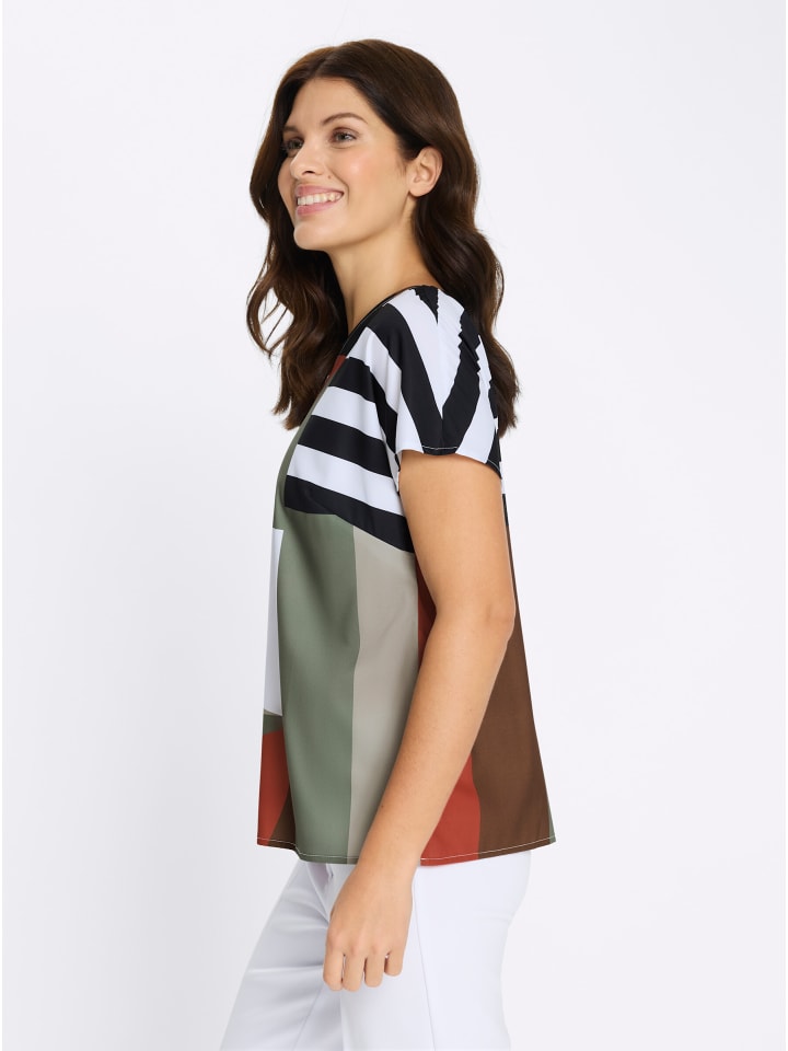 Эта блузка без застежки украшена эффектным графическим принтом спереди и сзади. Она также может похвастаться модным спущенным плечом и привлекательным V-образным вырезом.