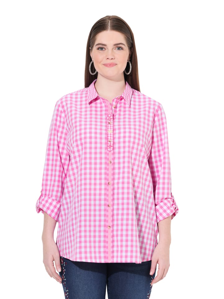 Традиционная клетчатая блузка с декоративной отделкой на планке с пуговицами. Контрастная клетка на воротнике и внутренней стороне манжет. Длинные рукава с подворачивающимися хлястиками длиной 3/4.