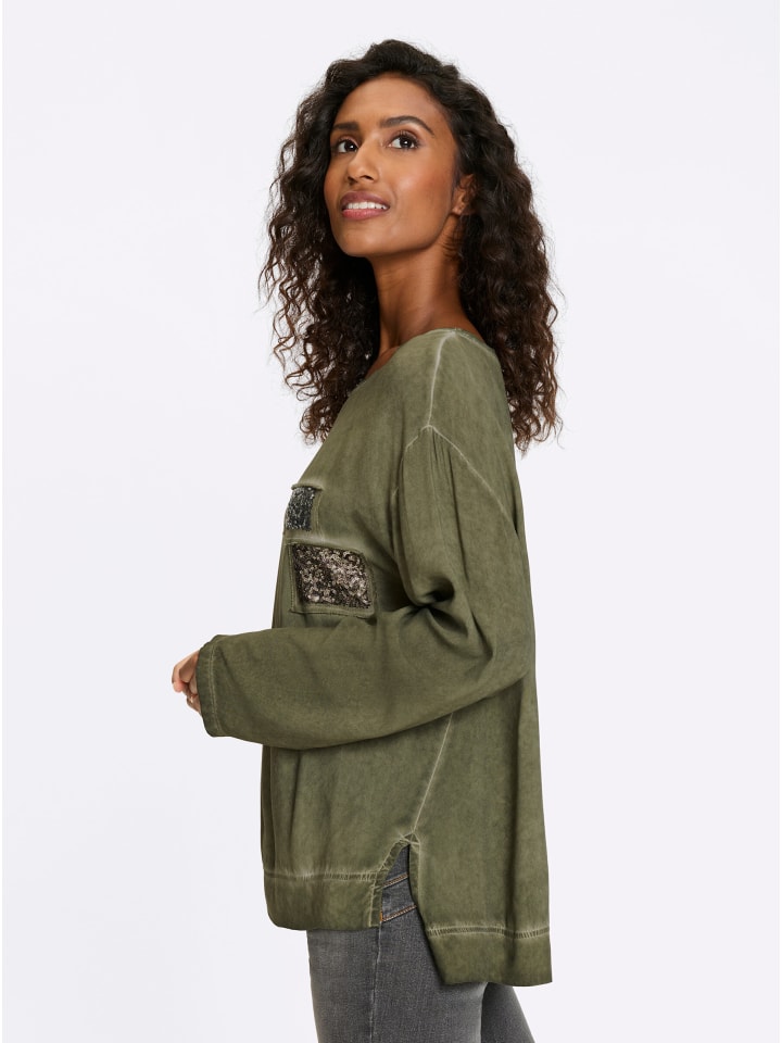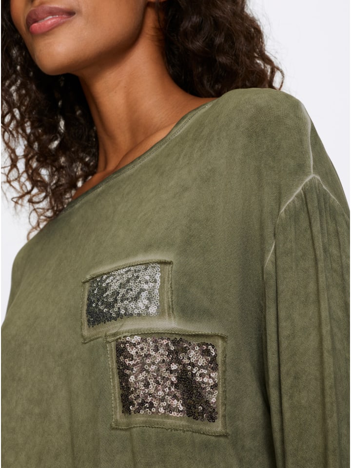Блузка из ткани, окрашенной маслом, с деталями из пайеток. Небрежно спущенная линия плеча и круглый вырез горловины. Длинные рукава.