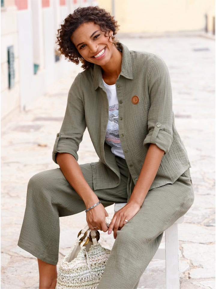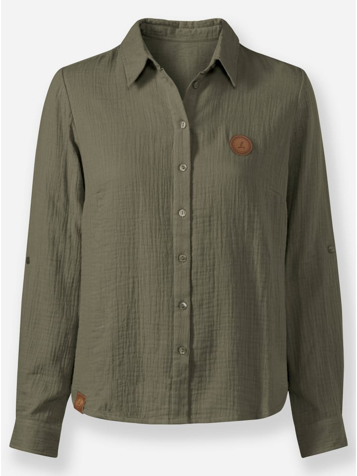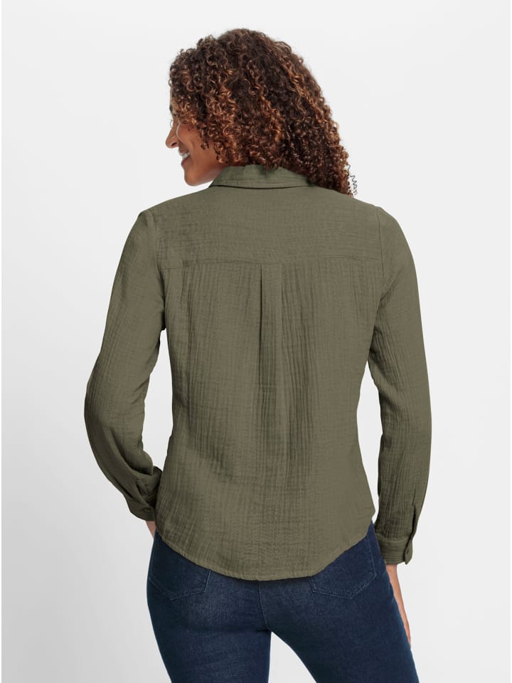 Изумительно мягкий муслин: структурированная блузка из чистого хлопка с рубашечным воротником, застежкой на пуговицы по всей длине, длинными рукавами с манжетами на пуговицах, которые можно закатать до трех четвертей благодаря хлястику и пуговице, и слегка закругленным нижним краем. Складка на спинке создает красивую драпировку, подчеркивающую фигуру. Поддерживает инициативу «Хлопок, сделанный в Африке».