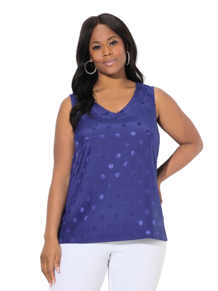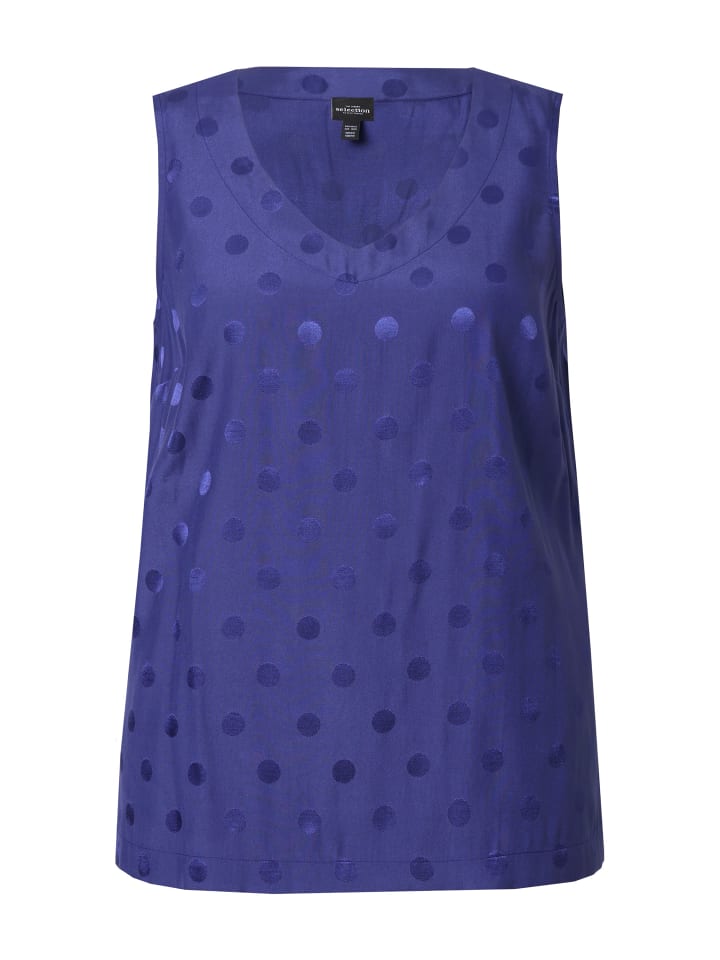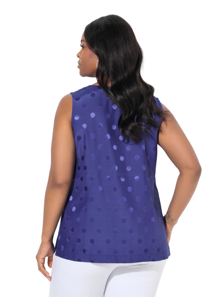 Верхняя часть блузки, без рукавов, классический крой, с тонким переливающимся жаккардовым узором в горошек. V-образный вырез, боковые разрезы для плавной драпировки.