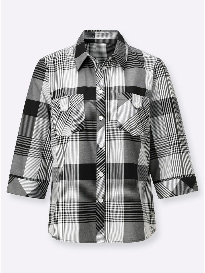 Эта клетчатая блузка непринужденна и невероятно проста в уходе. Она имеет рубашечный воротник, застежку на пуговицы по всей длине и накладные нагрудные карманы. Рукава три четверти с разрезами. Боковые разрезы на закругленном подгибе обеспечивают полную свободу движений. Изделие соответствует инициативе «Хлопок, сделанный в Африке».