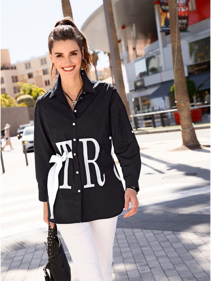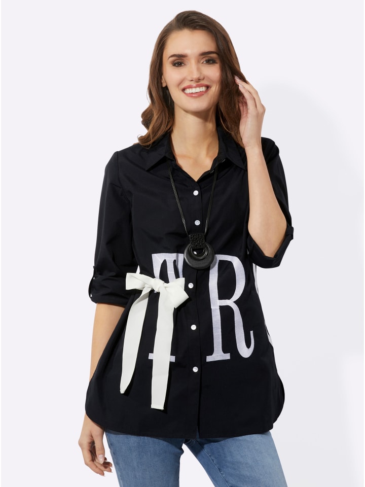 Доверьтесь нам - эта длинная блузка с эффектной вышивкой TRUST, идущей спереди назад, по-настоящему притягивает взгляды. Она имеет рубашечный воротник и планку с пуговицами. Длинные рукава с манжетами на пуговицах можно закатать до длины три четверти. Контрастный завязок сбоку подчеркивает талию. Блузка имеет приталенную кокетку и складку сзади, а также закругленные боковые разрезы. Поддерживает инициативу «Сделано в Африке» (Cat. Made in Africa).
