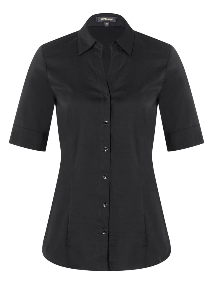 Идеальная офисная блузка от MORE & MORE с короткими рукавами и открытым воротником. Ее можно носить как с джинсами, так и в классическом стиле с брючным костюмом. Это абсолютная классика, которая должна быть в каждом гардеробе.