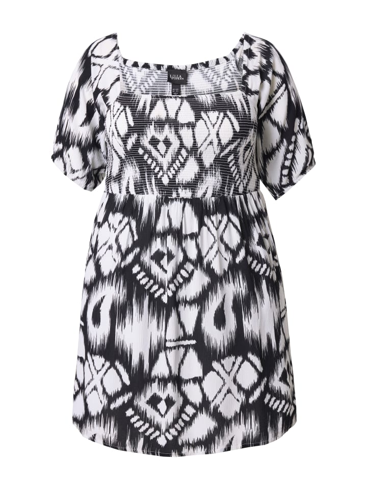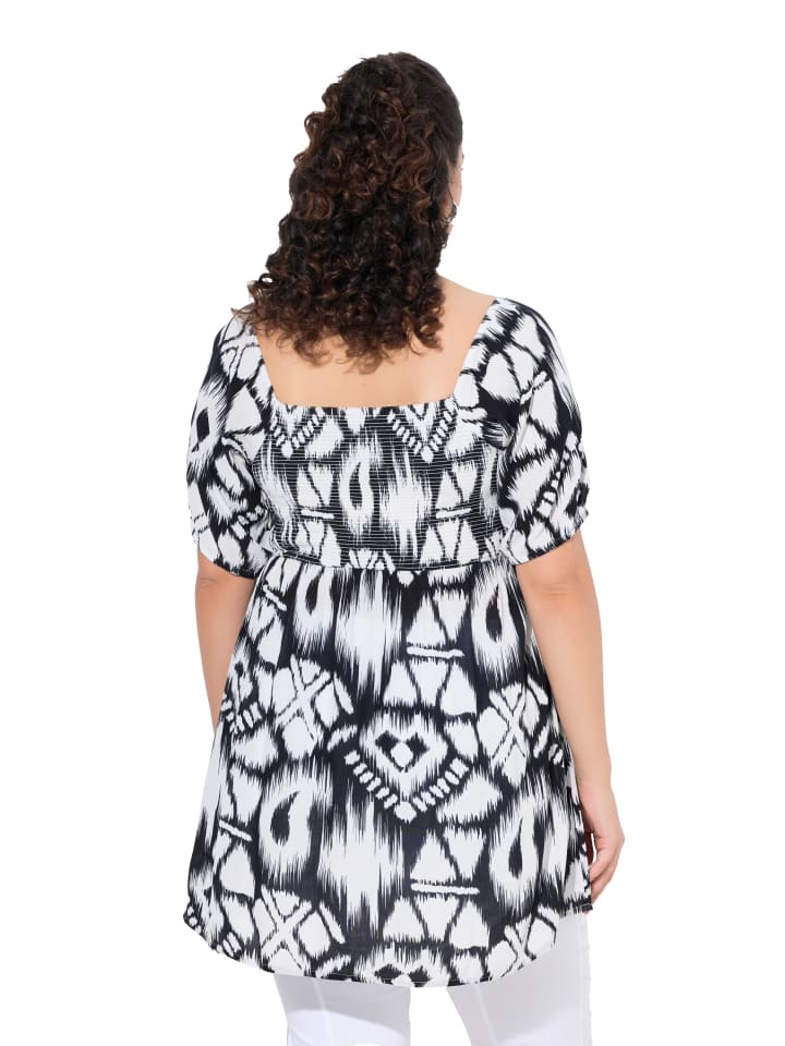 Блузка со сборками, А-силуэта, с принтом размера XL. Эластичный бюст, сборка, квадратный вырез, широкий низ. Широкие рукава реглан с манжетами на резинке.