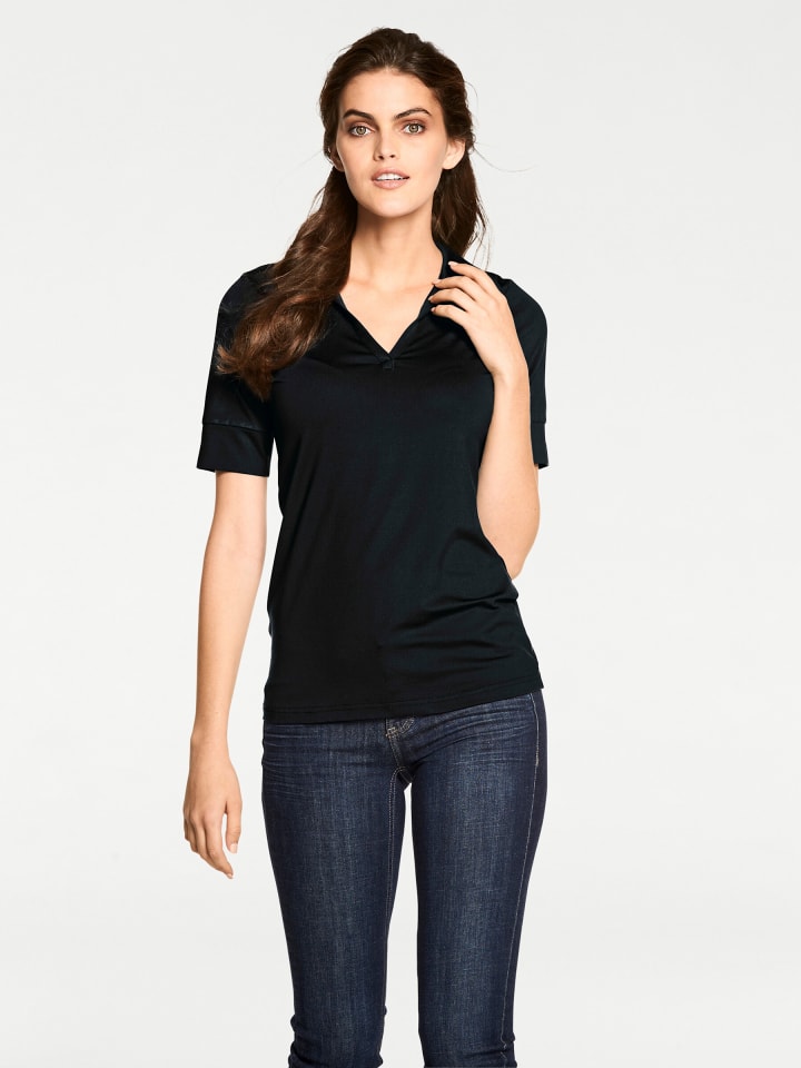 Блузка в элегантном, но спортивном стиле поло. Приталенный крой с короткими рукавами. Высокий комфорт при ношении, простота ухода. Tactel: высокотехнологичное волокно, не выцветает.