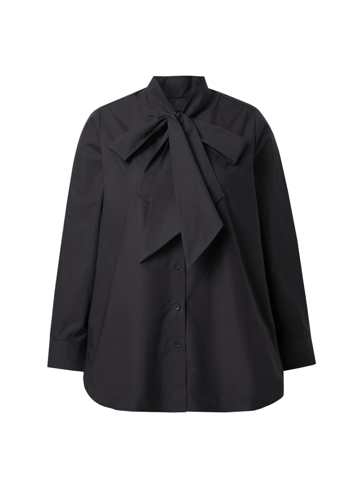 Блузка А-силуэта с завязкой, выполненная из высококачественного хлопка. Имеет модный завязочный воротник, воротник-стойку с лентой для банта, планку на пуговицах, длинные рукава с манжетами и закругленный низ.