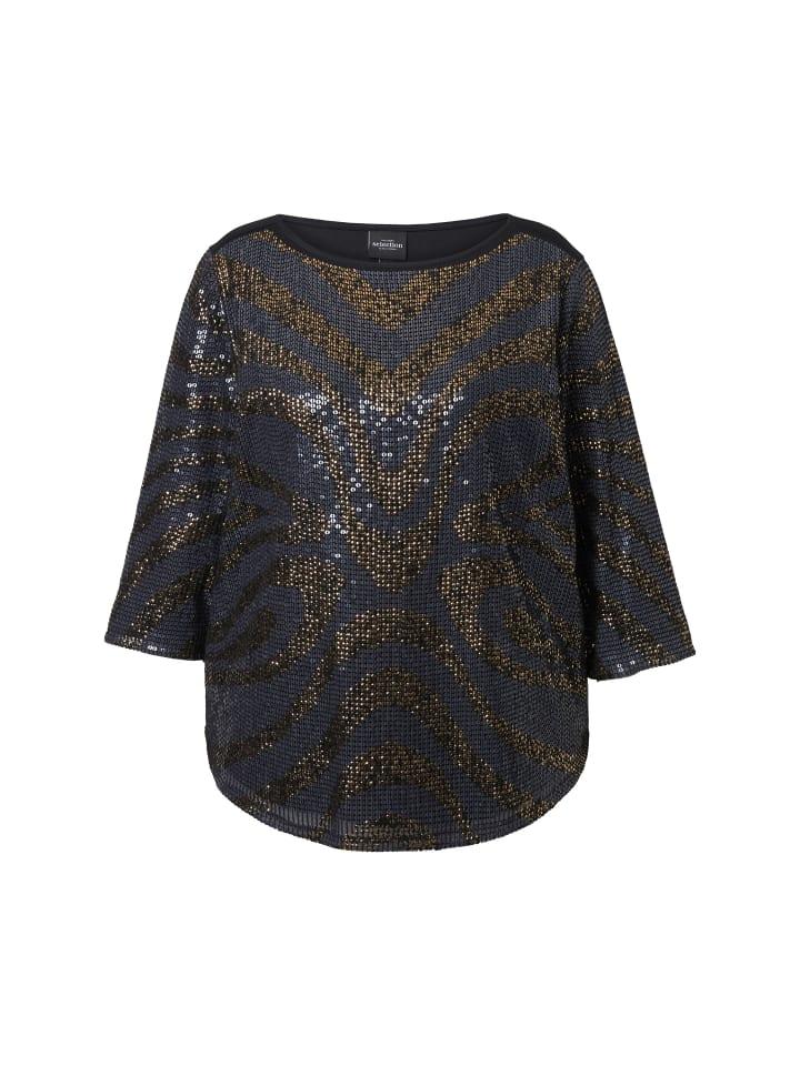 Блузка-рубашка, классический крой, двухслойная - блестящая сетка с пайетками и плотный трикотажный жакет. Вырез горловины «лодочка», рукава 3/4. Слегка закругленный низ.