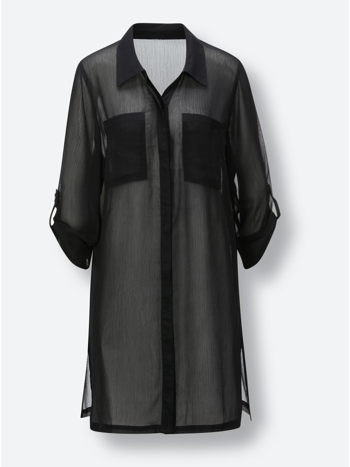 Тонкопрозрачная пляжная блузка свободного кроя. Отложной воротник, планка на пуговицах и закатанные рукава 3/4. Два больших нагрудных кармана. Длинные боковые разрезы для свободы движений.