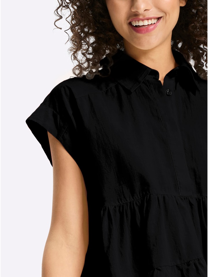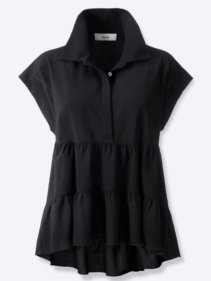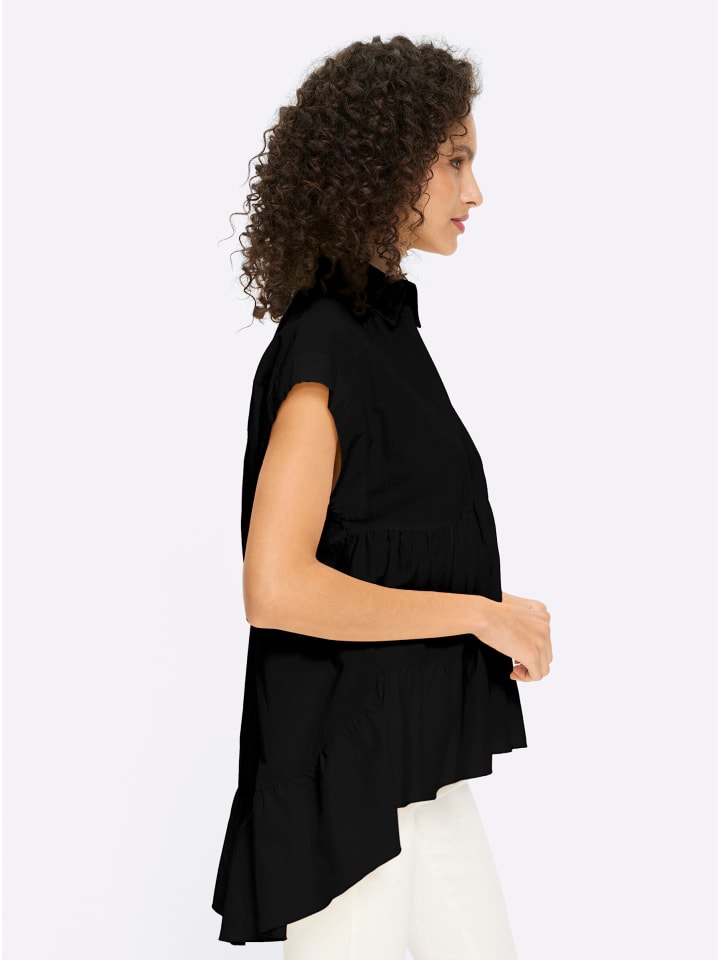 Блузка с короткими рукавами женственного силуэта ампир, с удлиненным струящимся оборкой по бокам и присборенными швами. Рубашечное декольте с потайной планкой на пуговицах. Спущенное плечо, короткие рукава. Удлиненная спинка. В соответствии с инициативой «Сделано в Африке» (Cat. Made in Africa).