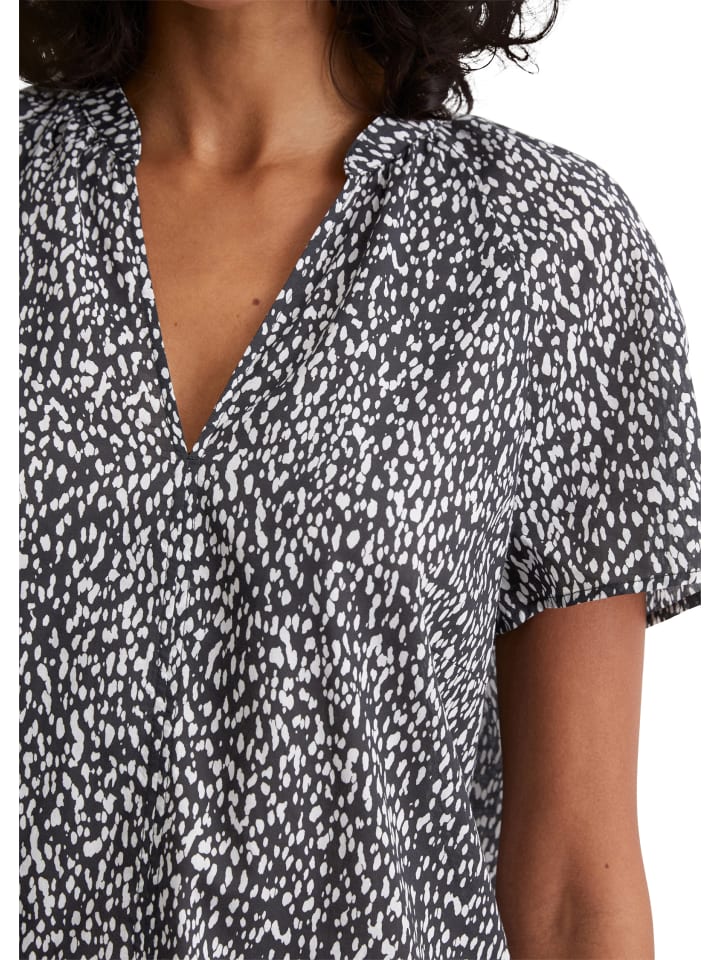Повседневная альтернатива классической блузке и классическим футболкам: блузка-рубашка. Эта свободная модель прямого кроя выполнена из высококачественной вуали из органического хлопка с принтом, короткими рукавами реглан и эффектным вырезом. Глубокий V-образный вырез дополнен воротником-стойкой и присборен для создания женственного образа. Эта универсальная модель станет надежным спутником и легко сочетается со многими низами. Хлопковая вуаль известна своей очень легкой, полупрозрачной текстурой, что делает ее идеальным вариантом для лета.
