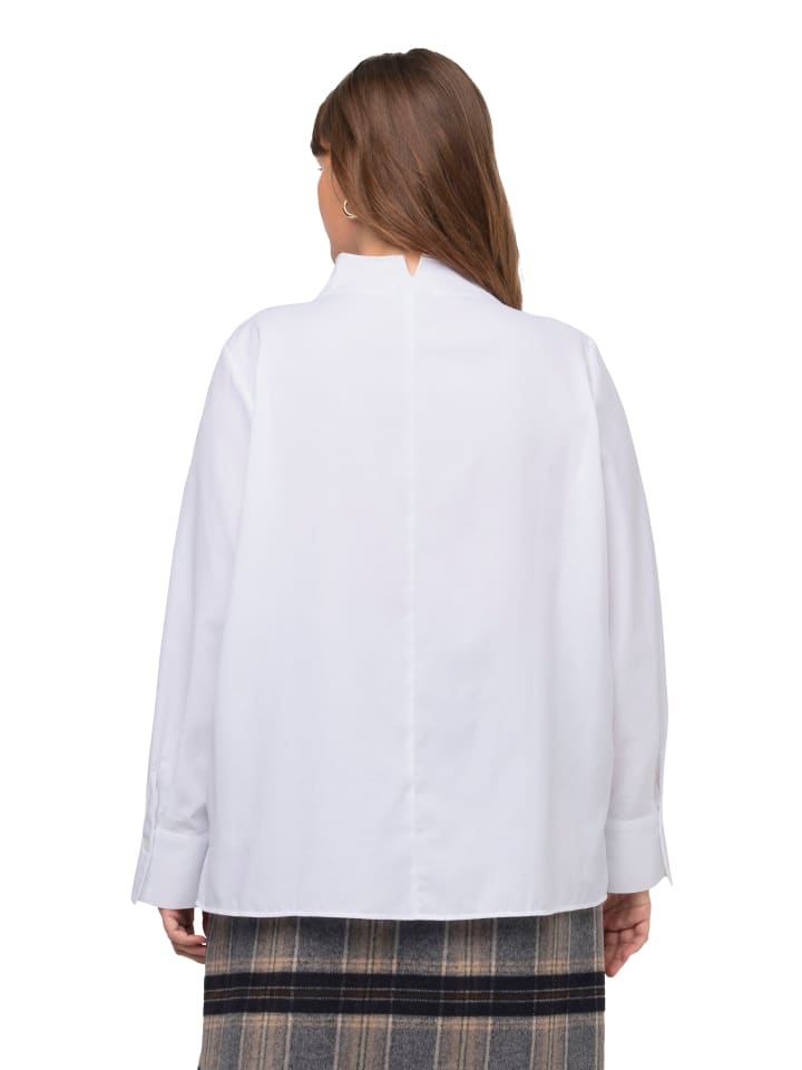 Блузка с воротником-стойкой, классического кроя, выполнена из высококачественной ткани «Оксфорд». Воротник-стойка с небольшим V-образным вырезом, застежка на пуговицы, боковые разрезы. Длинные рукава с манжетами.