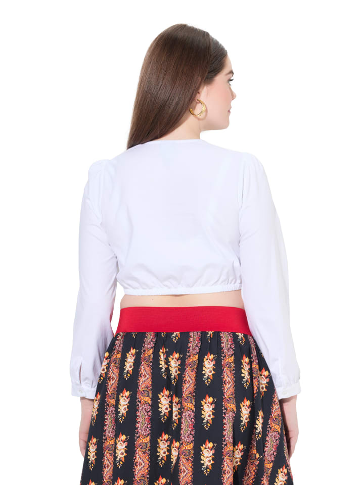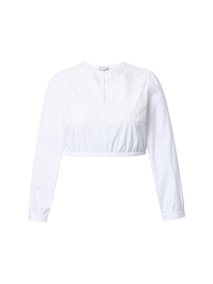 Дирндль-блузка с непрозрачной кружевной вставкой и длинными рукавами с манжетами. Круглый вырез горловины с застежкой на пуговицу и разрезом. Эластичный низ.