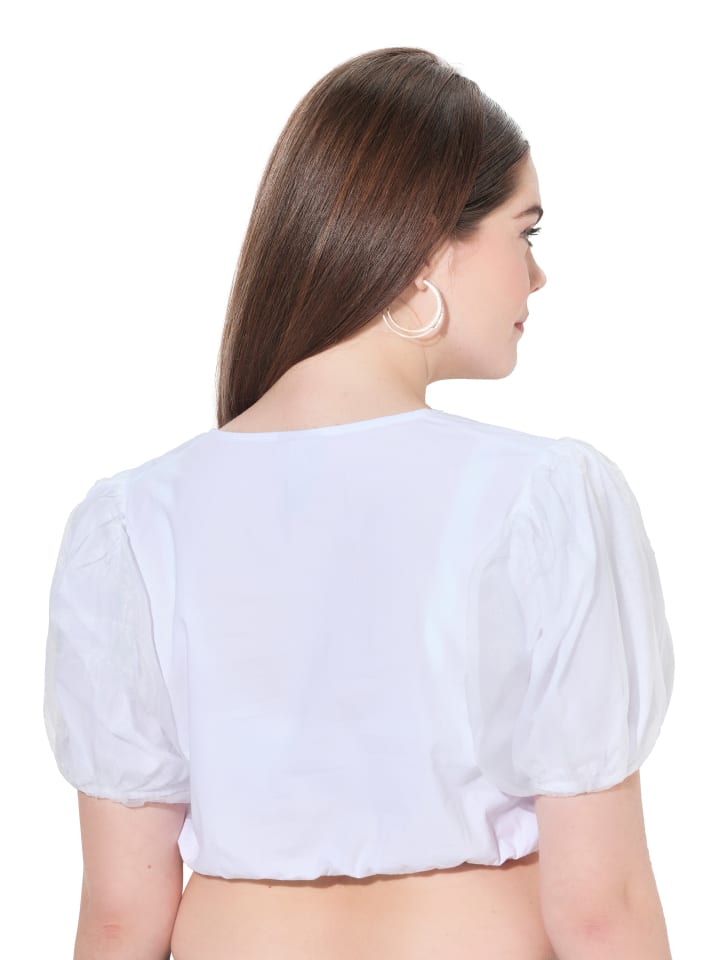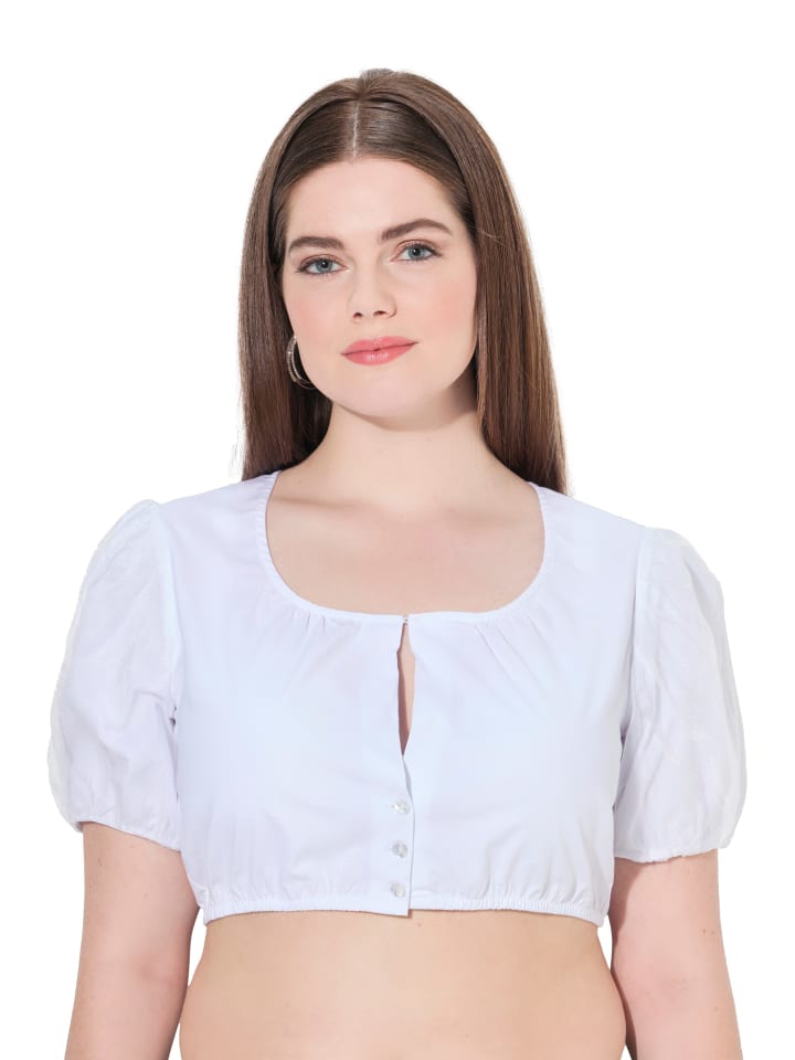 Дирндль-блузка с широкими короткими рукавами из тонкого тюля, на подкладке для непрозрачности и с эластичным подолом. Широкий круглый вырез горловины с потайной застежкой на пуговицы и планкой для пуговиц. Эластичный подолом.