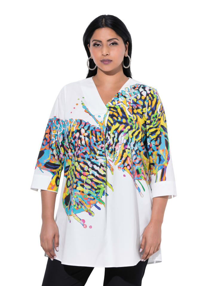 Туника А-силуэта из приятной на ощупь эластичной хлопковой ткани с очень крупным рисунком в виде бабочки, покрывающим весь перед, и рукавами три четверти. V-образный вырез с декоративной складкой и рукавами три четверти с разрезами. Слегка закругленный подол с боковыми разрезами обеспечивает дополнительный комфорт.