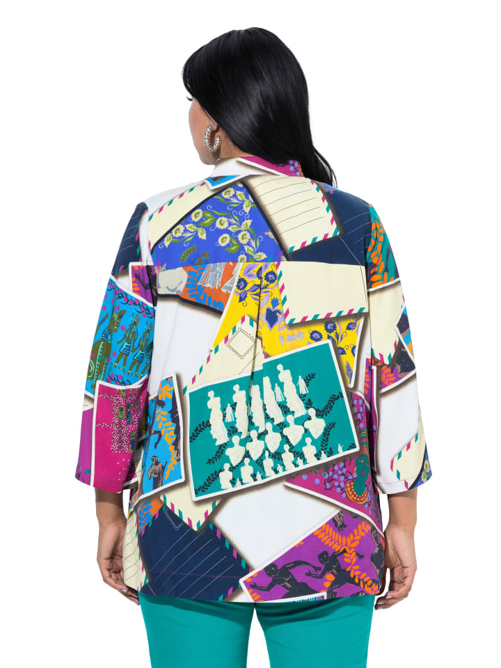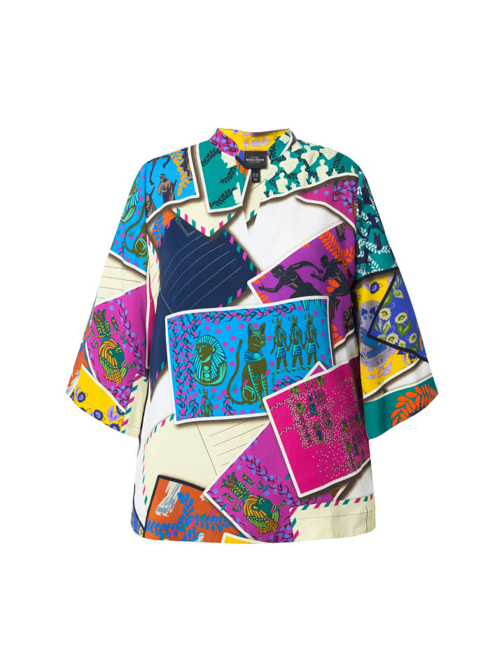 Туника из лиоцелла, А-силуэта, из натурального мягкого лиоцелла с рисунком в виде открытки. Воротник-стойка с V-образным вырезом, широкие рукава 3/4. Комфортная ширина подола.