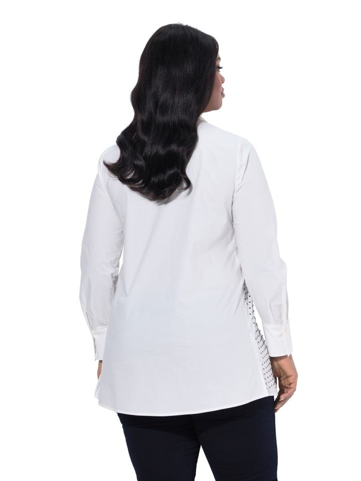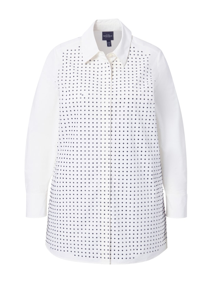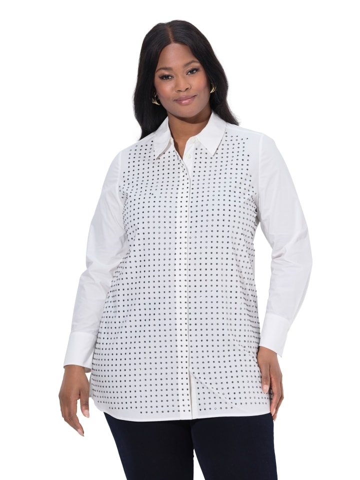 Блузка А-силуэта из мягкого хлопка. Изюминкой являются элегантные украшения из стразов спереди. Отложной воротник, потайная застежка на пуговицы, длинные рукава с манжетами. Боковые разрезы для дополнительного комфорта.