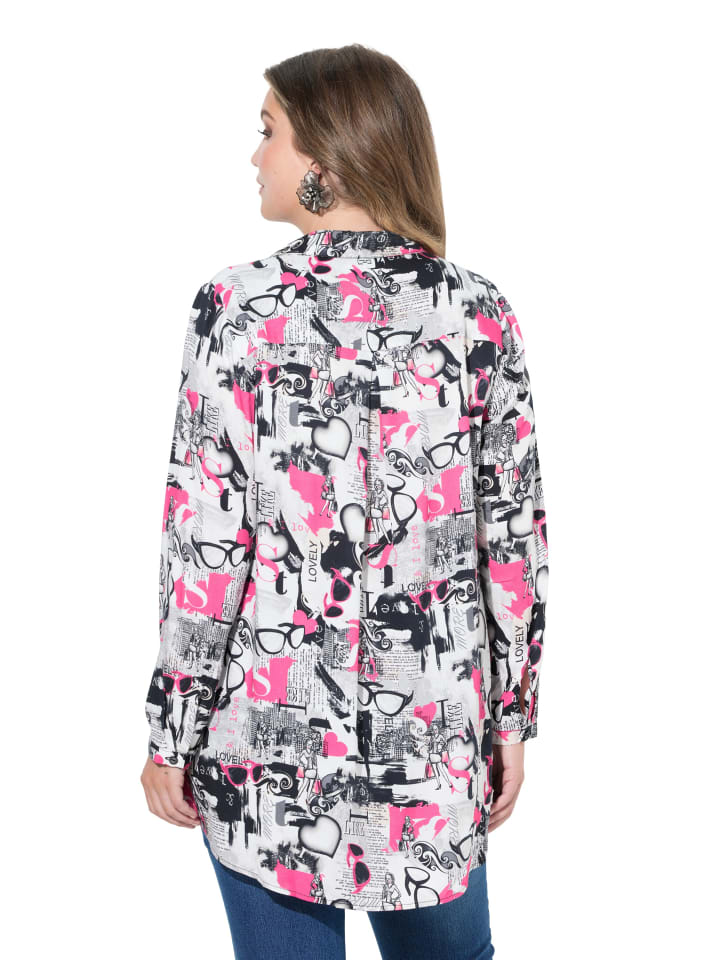 Блузка, слегка удлиненного А-силуэта, из мягкой вискозы с рисунком в виде очков. Воротник рубашечного кроя с V-образным вырезом, планка на пуговицах, длинные рукава с манжетами. Широкий, закругленный подол, сзади примерно на 12 см длиннее.