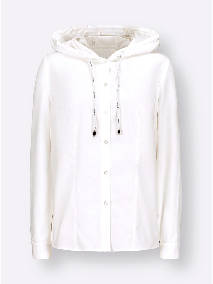 Довольно повседневная и полностью в тренде: эластичная, удобная блузка с капюшоном и завязками. Детали: застежка на пуговицы по всей длине, длинные рукава с разрезами на манжетах и слегка закругленный, удлиненный подол сзади. Складка сзади создает красивую драпировку. Соответствует инициативе «Хлопок, сделанный в Африке».