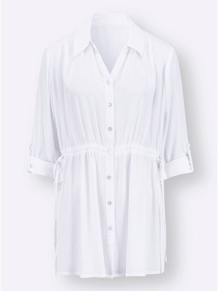 Повседневная, воздушная, мне нравится! Длинная блузка с открытым воротником и планкой на пуговицах. Талию можно регулировать с помощью кулиски и пояса. Длинные рукава с манжетами и разрезами можно закатать и закрепить. Длинные боковые разрезы обеспечивают дополнительный комфорт и оптимальную свободу движений.