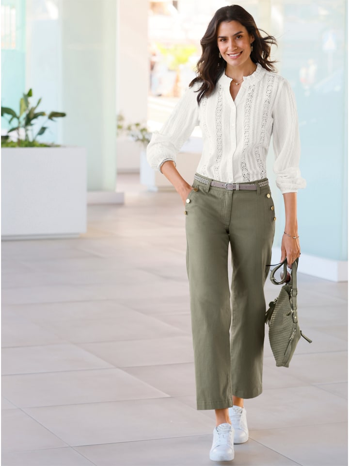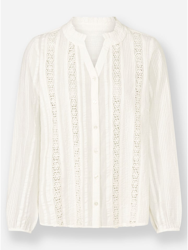 Эта изысканная блузка очаровывает многочисленными деталями: эффектный сирсакер с кружевной отделкой, оборки на комбинированном круглом и V-образном вырезе с планкой на пуговицах и эластичные манжеты на длинных рукавах. Спинку украшает кокеточка и блочная складка для увеличения ширины. Низ слегка закруглен. Соответствует инициативе «Хлопок, сделанный в Африке».