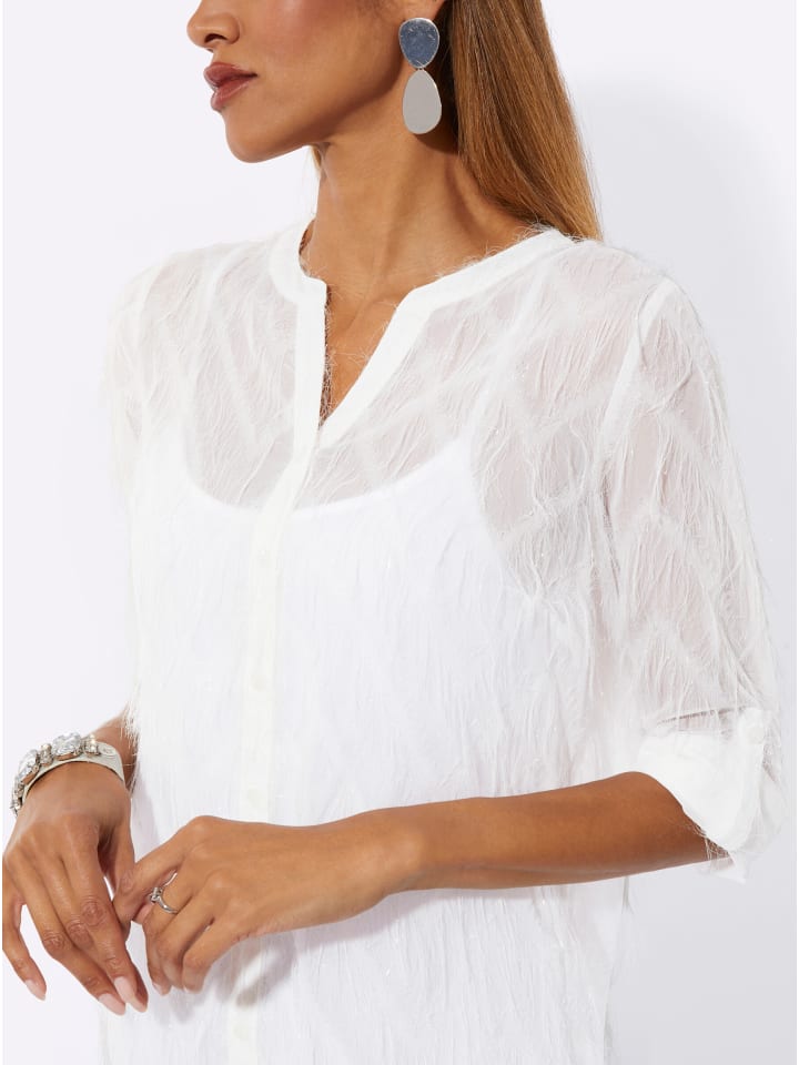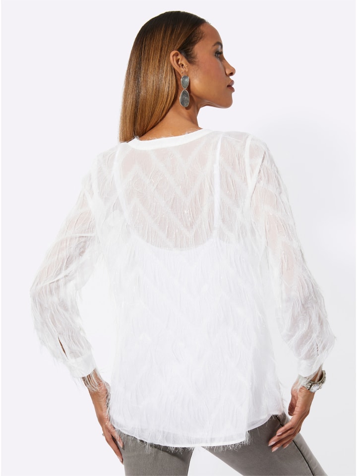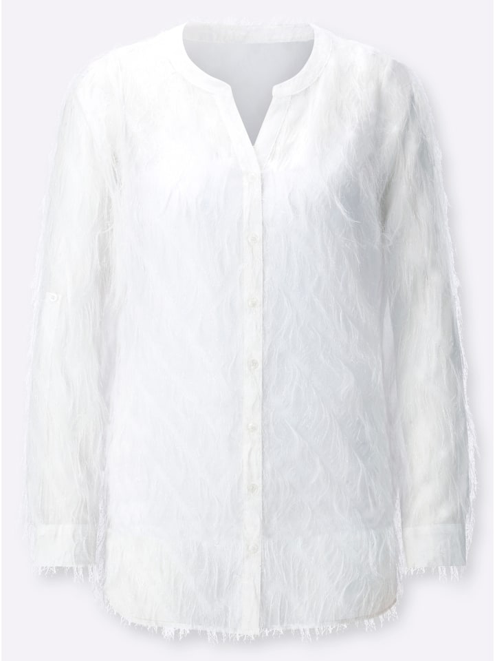 Эта блузка - настоящий хит сезона благодаря экстравагантной бахроме. Она имеет комбинированный круглый и V-образный вырез, а также планку на пуговицах. Верх на тонких бретельках обеспечивает полную защиту и застегивается на петлю и кнопку с внутренней стороны плеча. Низ слегка скруглен. Длинные рукава с манжетами можно подвернуть до длины три четверти и застегнуть на хлястик и пуговицу.