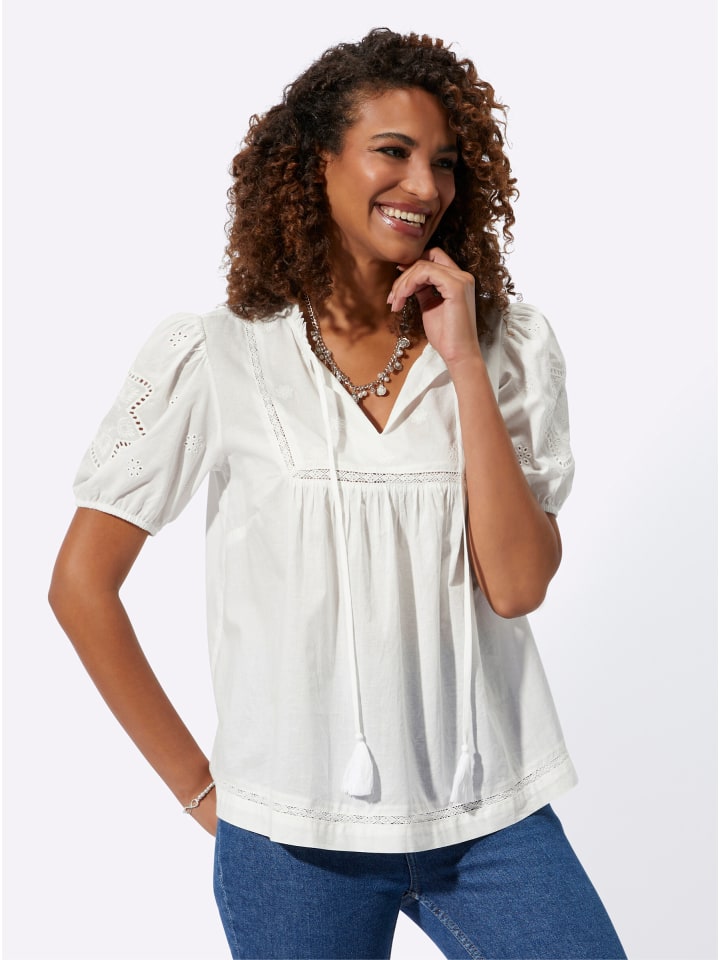 Эта блузка-туника излучает романтическое очарование благодаря узкой оборке на комбинированном круглом и V-образном вырезах, дополненной завязками и кисточками. Цветочная вышивка с отделкой крючком украшает переднюю часть, как и отделка крючком по подолу. Модные рукава-буфы с вышивкой люверсами и эластичными манжетами. Складки под передней частью и кокеткой на спинке создают привлекательный силуэт. Поддерживает инициативу «Хлопок, сделанный в Африке».