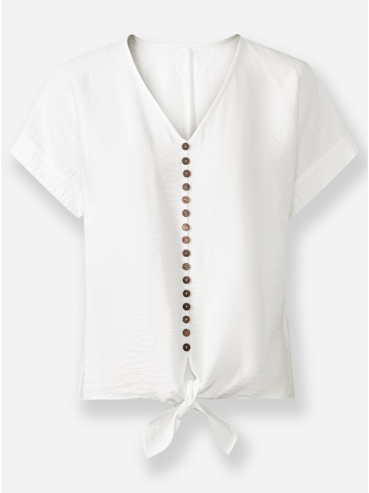 Удобная блузка из высококачественной, слегка мерцающей фактурной ткани. V-образный вырез, спущенные плечи и обтачка по низу. Центральный шов спереди с декоративными пуговицами с эффектом кокоса заканчивается небольшим разрезом, который можно завязать для создания модного образа.