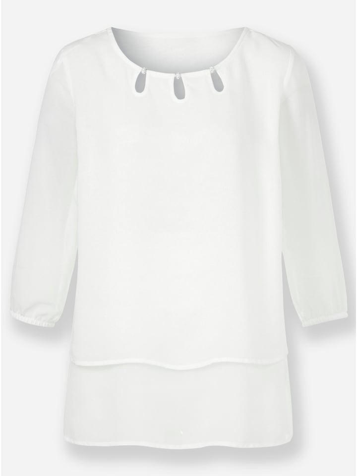 Удлиненная модель с эффектным многослойным эффектом - слегка прозрачная блузка из жоржета. Три выреза с окантовкой и мерцающая серебряная отделка на круглом вырезе. Идеально подходит в качестве многослойного наряда: тонкий топ, стильно подчеркивающий прозрачность. Эластичные манжеты на рукавах три четверти. Слегка закругленный подол.