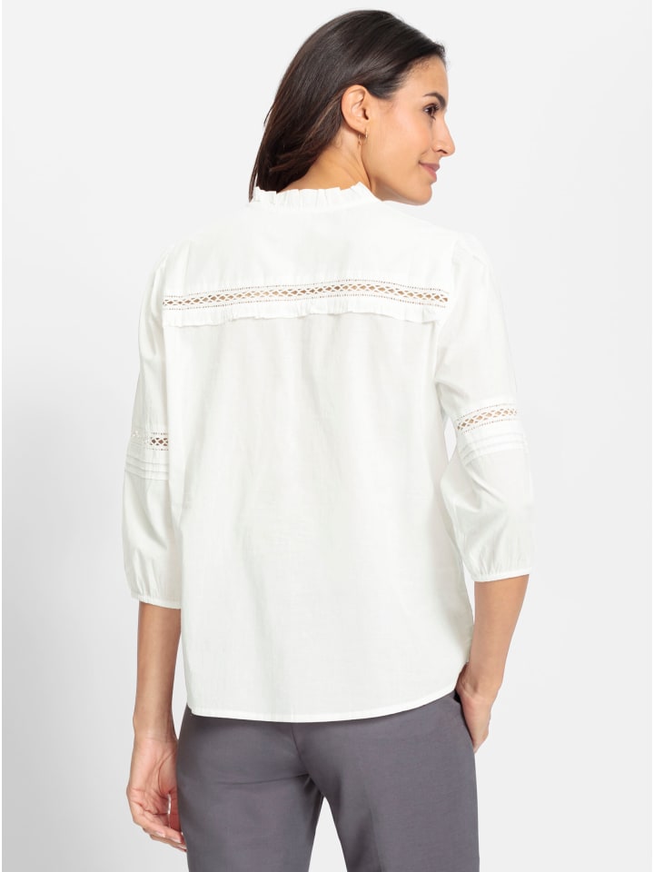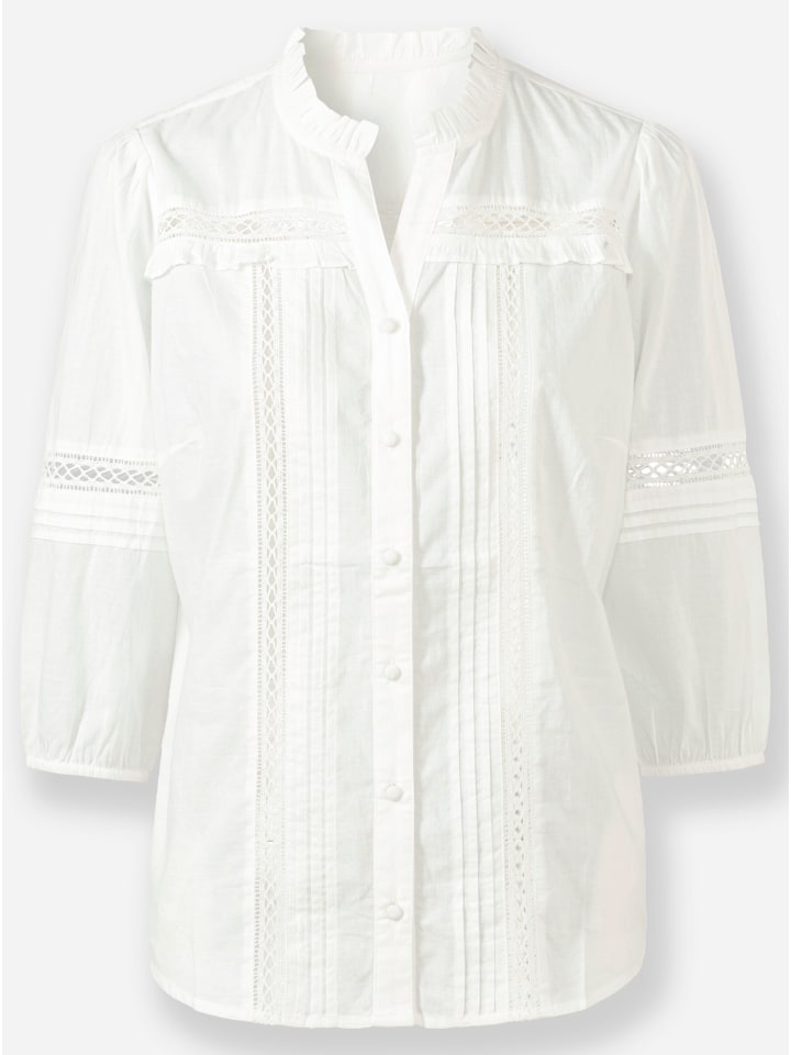 Эта хлопковая блузка романтична благодаря своим очаровательным деталям: оборкам на воротнике и кокетке, складкам и отделке кружевом, имитирующим вязание крючком, спереди и на рукавах, присборенным плечам и эластичным манжетам на рукавах 3/4. Блузка имеет V-образный вырез, застежку на пуговицы, обтянутые тканью, и корректирующие вытачки на груди. Низ слегка закруглен. Изготовлена из приятного хлопка. Соответствует инициативе «Сделано в Африке» (Cotton made in Africa).