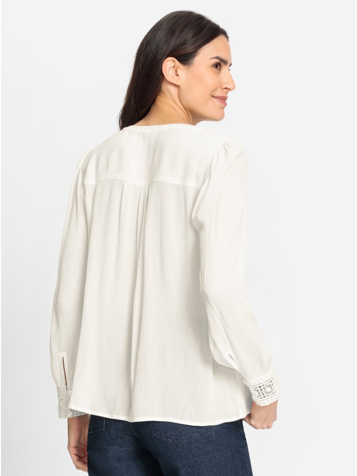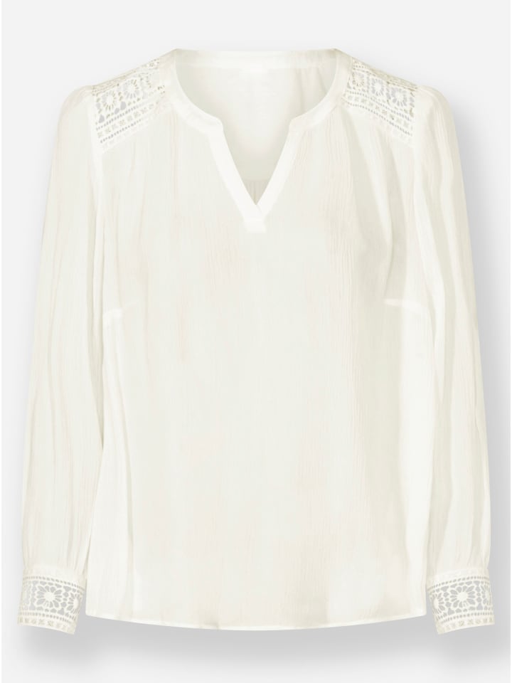 Элегантная блузка с жатым эффектом, вставками из прозрачного кружева на плечах и манжетах длинных рукавов, застегивается на эластичные петли и пуговицы. Круглый вырез горловины с открытым V-образным вырезом позволяет легко надевать блузку. Привлекательные сборки расположены под кокеткой спереди и сзади, а также на плечах. Блузка с вытачками на груди. Изготовлена из вискозы ECOVERO производства Lenzing.
