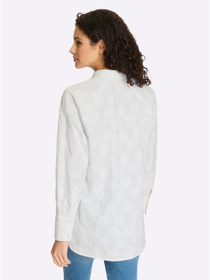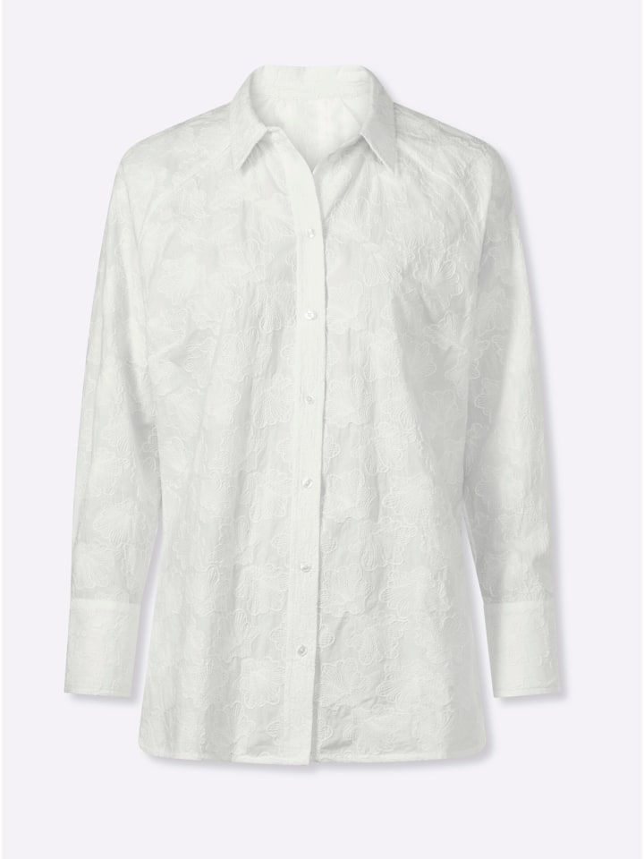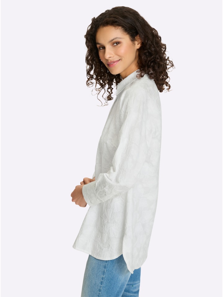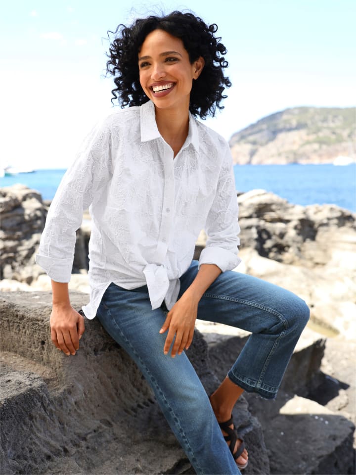 Блузка из чистого хлопка с замысловатым фактурным узором и элегантными кружевными деталями. Имеет рубашечный воротник, застежку на пуговицы по всей длине и длинные рукава с манжетами на пуговицах. Закругленный низ с боковыми разрезами. Поддерживает инициативу «Хлопок, сделанный в Африке».