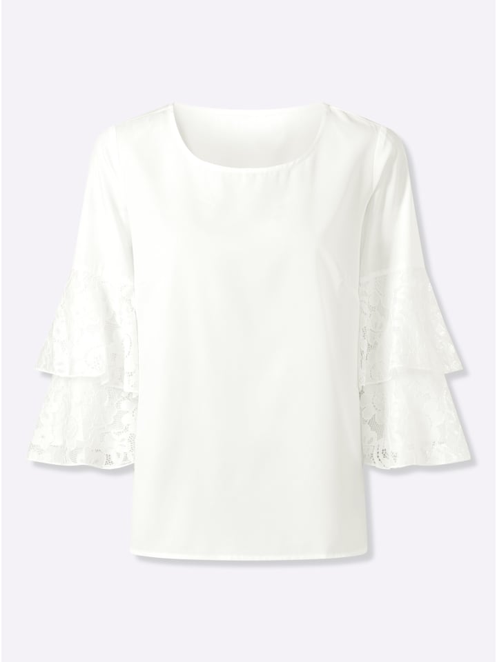 Добавьте элегантности вашему образу с этой изысканной блузкой без застежек! Рукава-трубы длиной 3/4 украшены кружевными оборками. Круглый вырез горловины и корректирующие вытачки на груди.