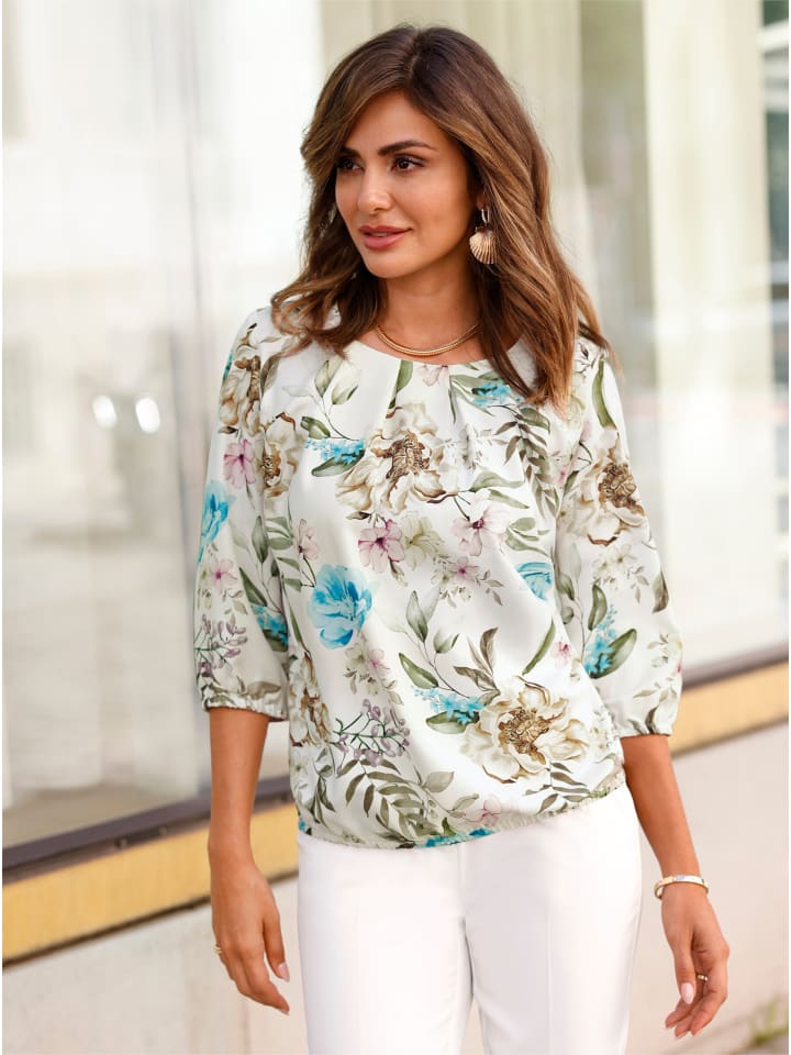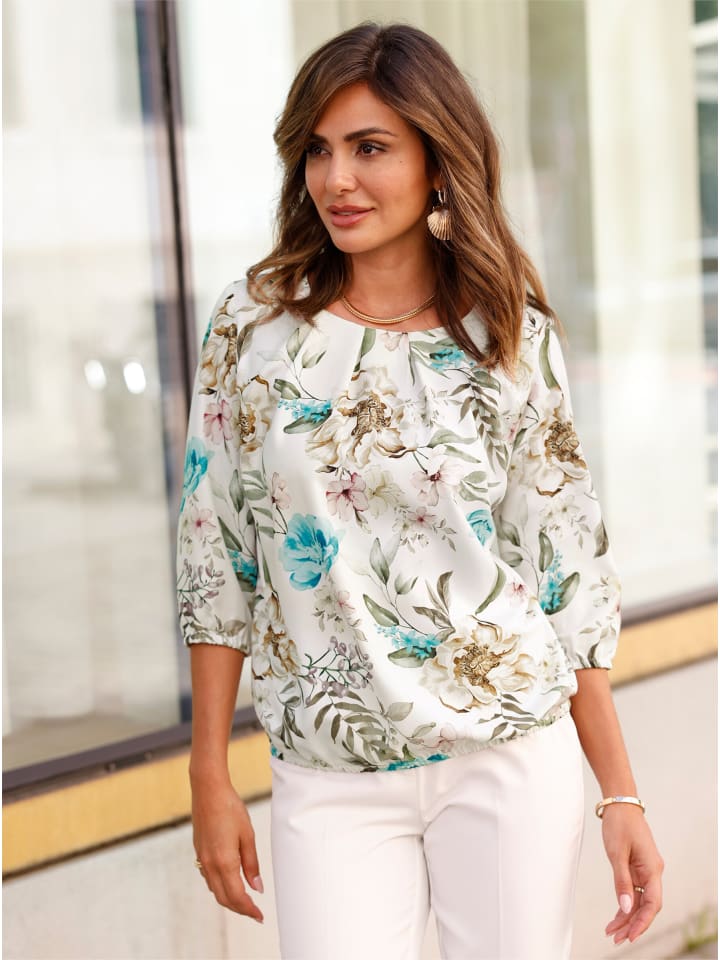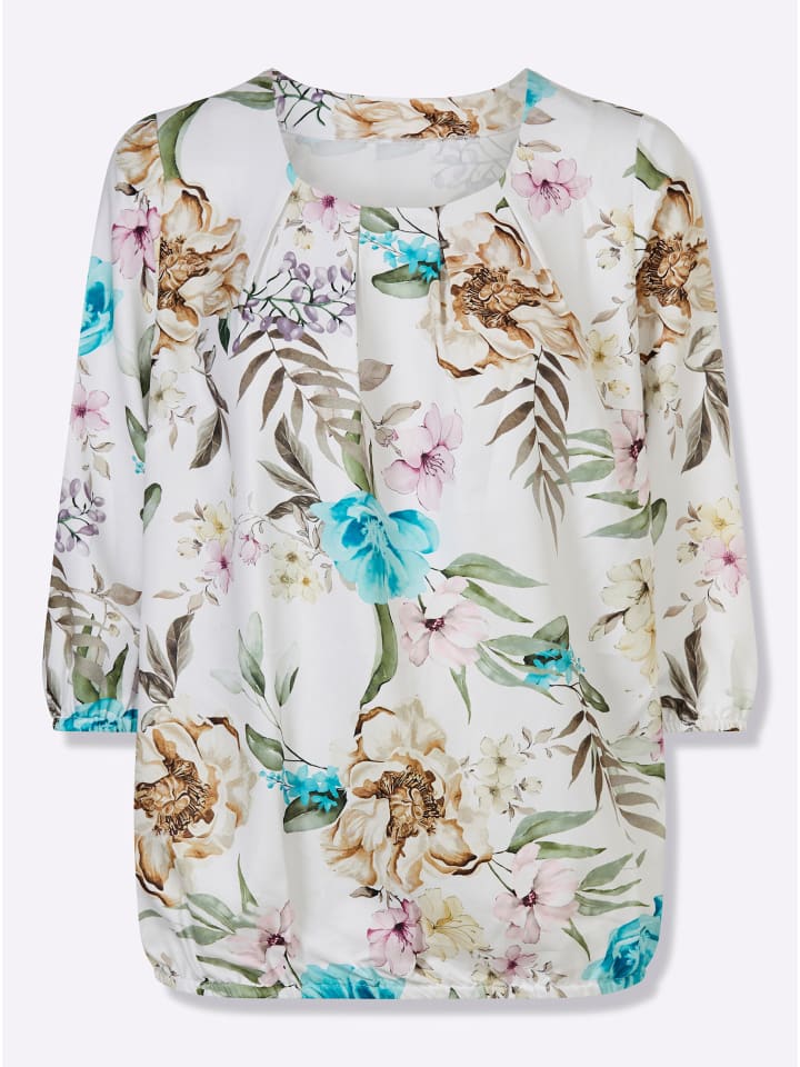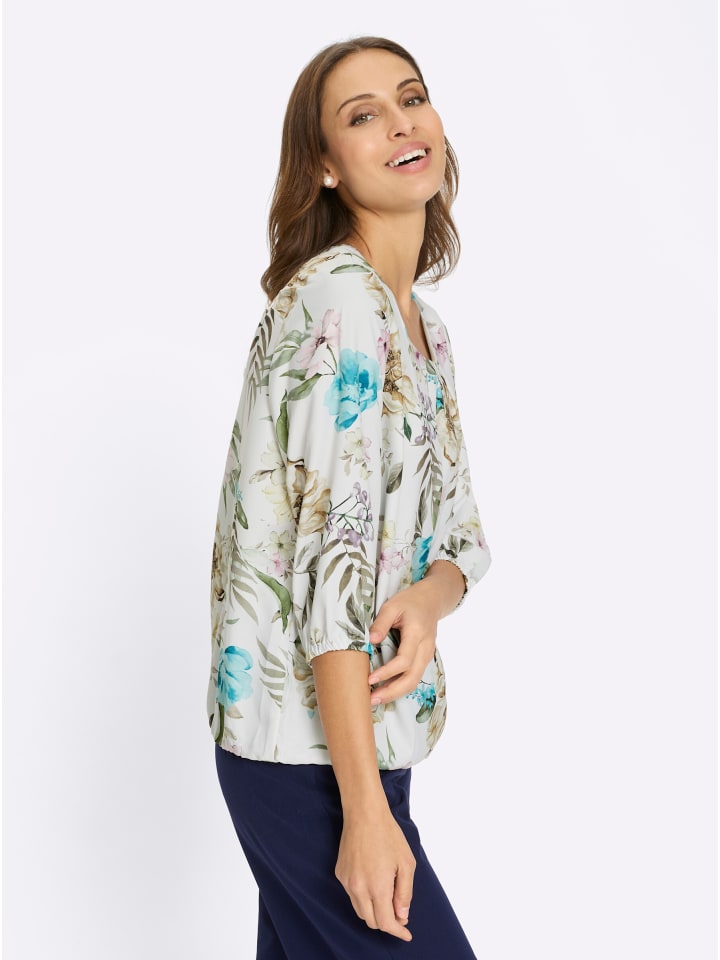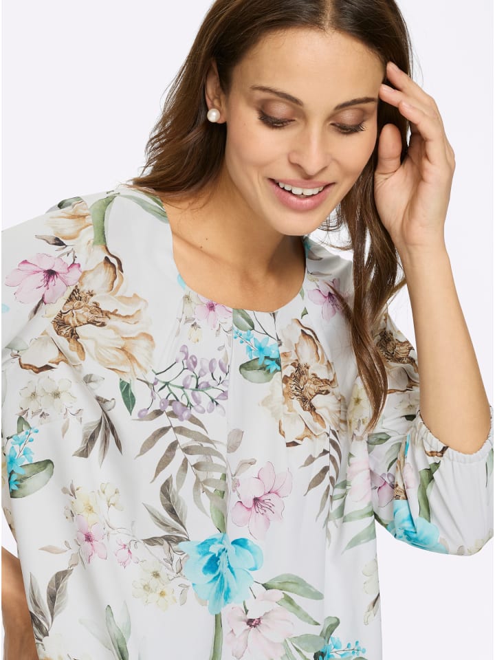 Эта блузка с цветочным принтом красиво драпируется и мягко струится. Круглый вырез горловины со складками для удобной посадки, корректирующие вытачки на груди, рукава 3/4 и эластичный подол. Изготовлена из переработанного полиэстера.