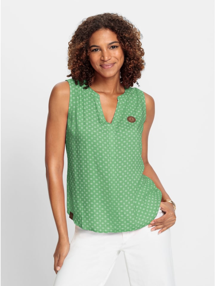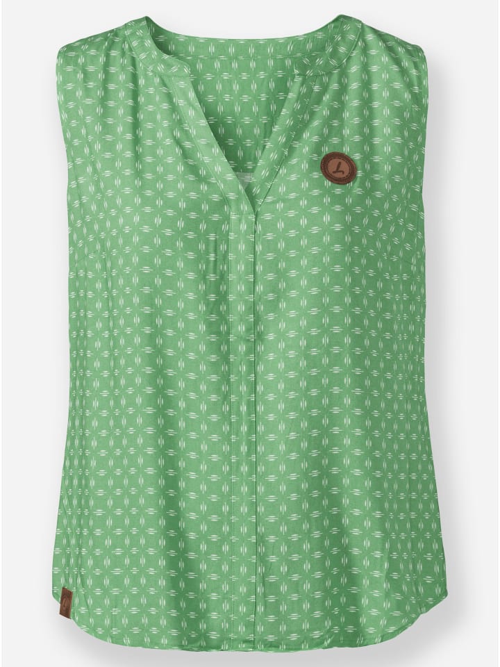 Удобная блузка с круглым вырезом и V-образным вырезом. Передняя часть подчеркивает фигуру. Складка сзади стройнит. Слегка закругленный низ. Изготовлена из высококачественной ткани ECOVERO компании Lenzing.