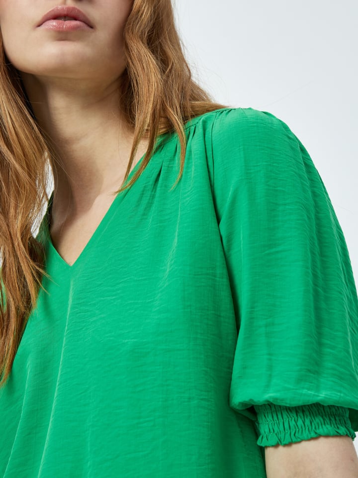 Блузка Ayame из мягкой ткани удобна и приятна на ощупь. V-образный вырез и рукава до середины голени идеально сочетаются с джинсами или брюками. Манжеты рукавов эластичные и слегка присборены.