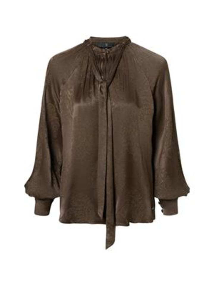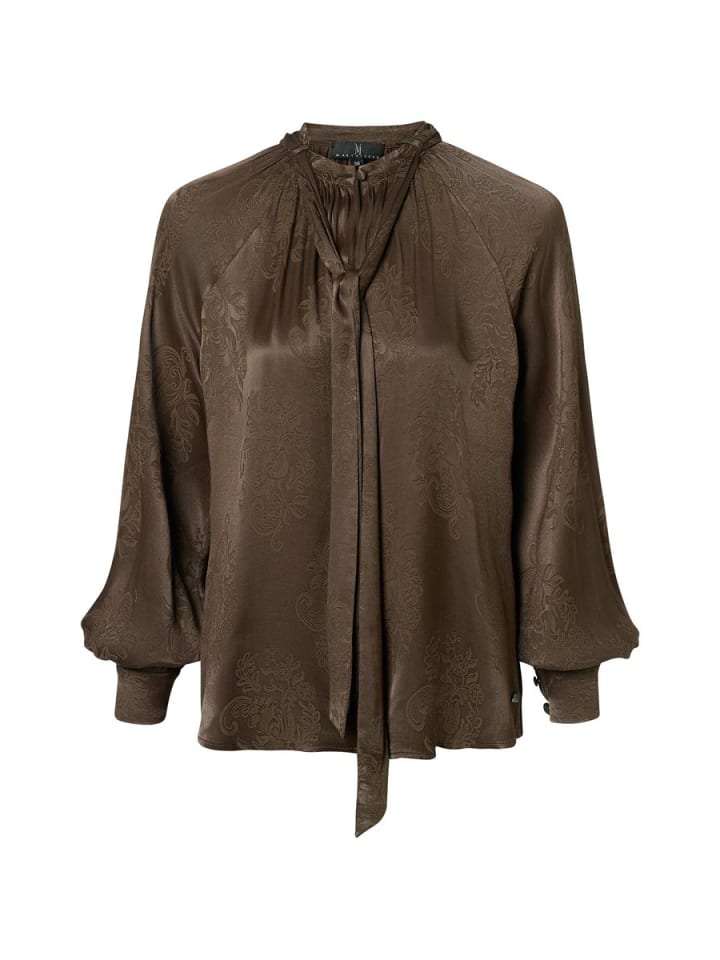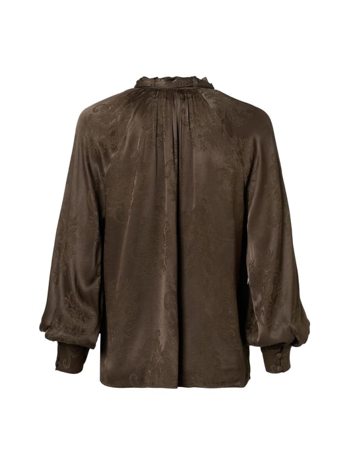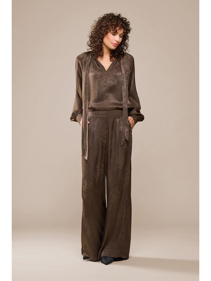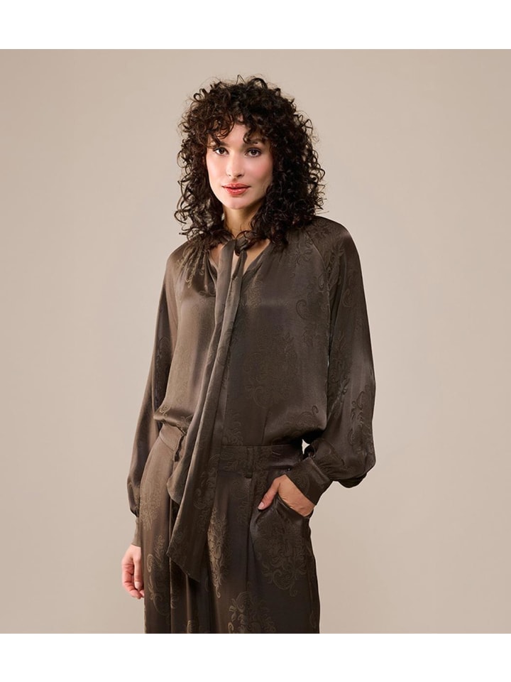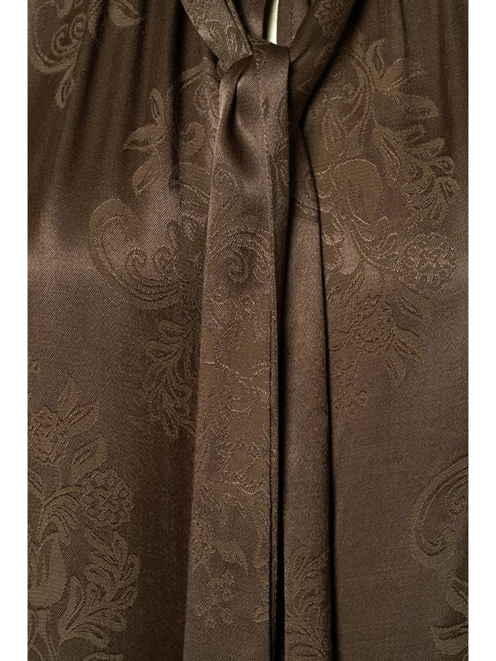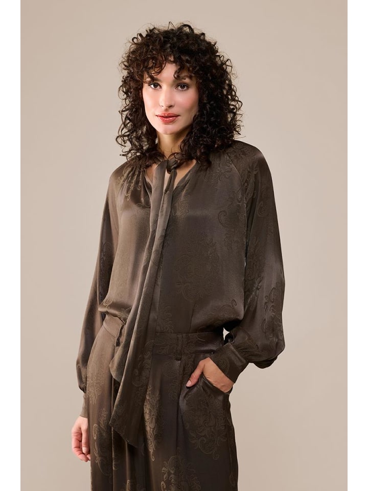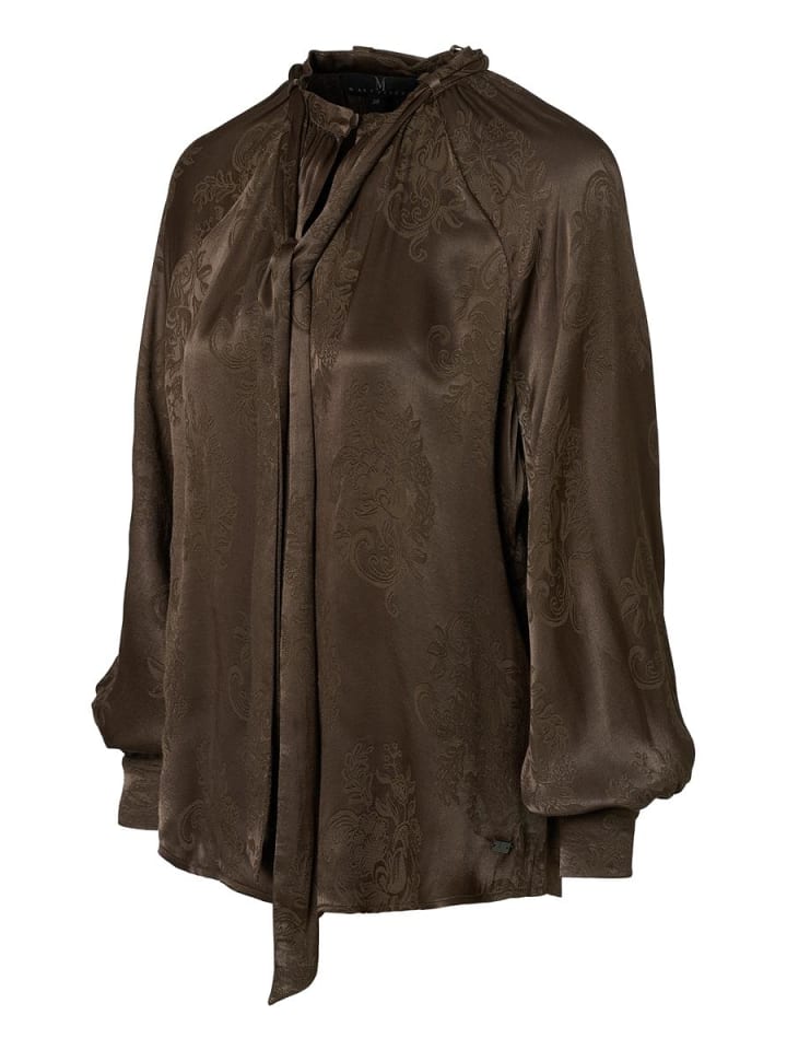 Темно-коричневая жаккардовая блузка от Mart Visser - изысканный must-have, который легко дополнит как деловой, так и повседневный образ. Роскошная жаккардовая ткань с нежным цветочным узором придает модели элегантный вид и уникальную текстуру. Воротник-стойка и элегантный вырез «замочная скважина» спереди подчеркивают шик, а шарфик - ваш индивидуальный стиль. Сочетайте блузку с подходящими жаккардовыми брюками для создания монохромного эффекта или наденьте ее с кожаной юбкой или классическими брюками для стильного офисного или вечернего образа. Для создания современного образа легкие джинсы идеально дополнят теплые оттенки. Аксессуары, такие как золотые украшения, клатч и элегантные туфли, сделают образ более изысканным. Благодаря классическому крою и высококачественной обработке эта блузка станет долговечным приобретением, которое будет радовать вас долгие годы.