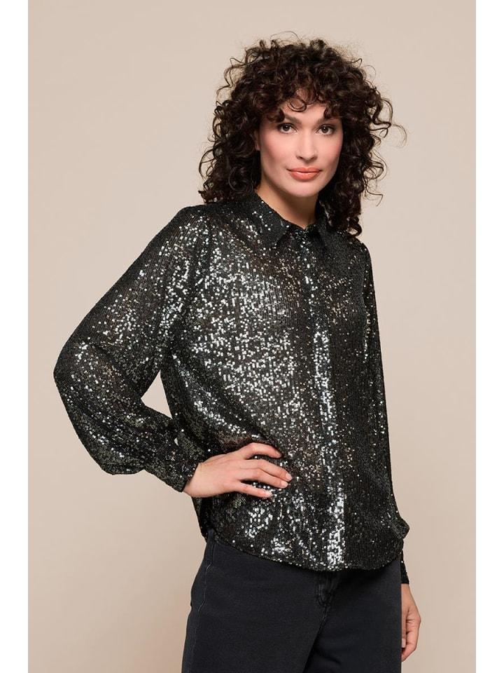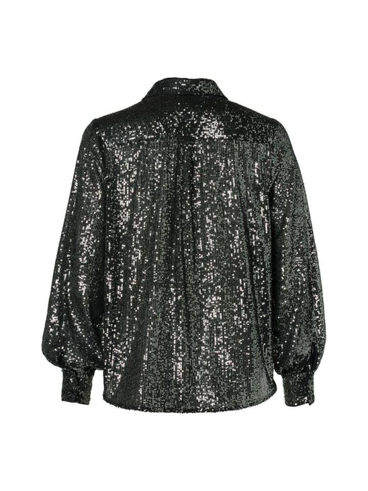 Сияйте ярко в этот праздничный сезон с блузкой Cerise с пайетками в серо-зеленых тонах. Блузка богато украшена сверкающими пайетками на черном фоне, создавая роскошный и слегка мерцающий эффект. Классический лацкан и длинные рукава со слегка присборенными манжетами добавляют изысканности и женственности. Потайная застежка на пуговицы спереди придает модели чистый и элегантный вид. Прямой, струящийся силуэт, ниспадающий до бедер, обеспечивает комфорт и стиль. Сочетайте блузку с подходящими брюками с пайетками для создания праздничного образа или наденьте ее с черными брюками или юбкой для создания шикарного и элегантного образа. Модный совет: если вы любите мерцание, дополните блузку другими вещами из той же ткани с пайетками, например, платьем, туникой или юбкой, чтобы создать полноценный праздничный образ.