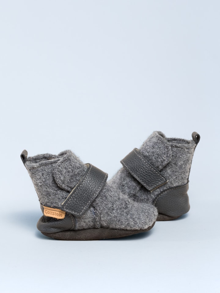 Комбинация шерсти и кожи. Верх изготовлен из 100% натуральной шерсти, что обеспечивает комфортный микроклимат стопы благодаря терморегулирующим свойствам. Эластичная вставка между шерстью и кожей обеспечивает идеальную посадку и надежную фиксацию. Ничто не помешает активным играм дома, в детском саду или яслях. Доступны с различными аппликациями.