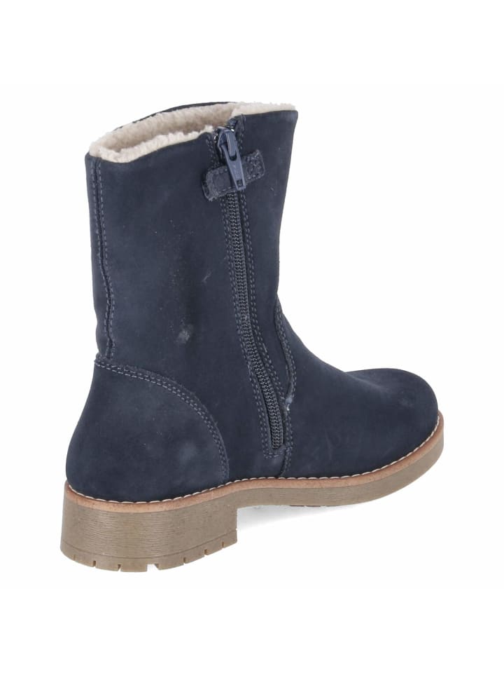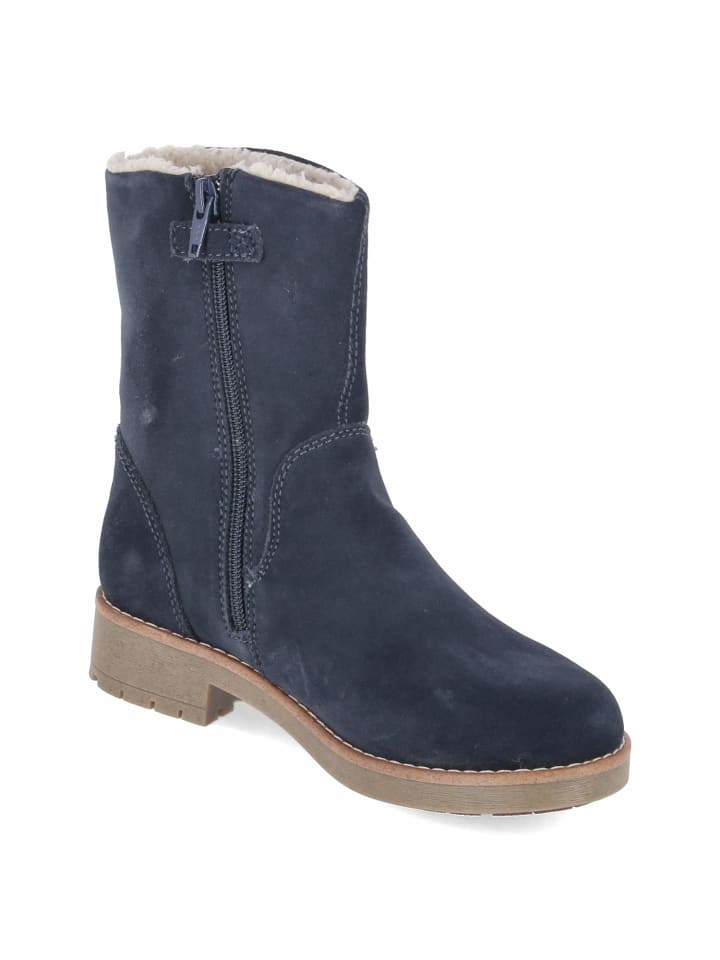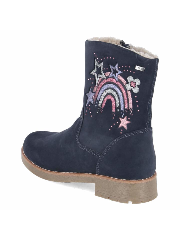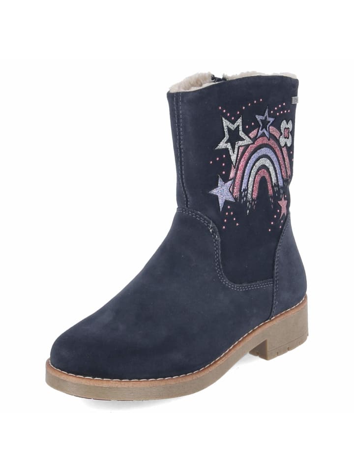 Зимние ботильоны FAE TEX от Lurchi обеспечат оптимальную защиту детских ножек в течение всего сезона. Синяя замша прочная, водоотталкивающая и имеет водонепроницаемый верх, а теплая подкладка и текстильная стелька обеспечивают надежное тепло. Закругленный носок обеспечивает свободу движений, а нескользящая подошва и блочный каблук высотой 3 см обеспечивают надежную опору. Практичные и удобные для детей: боковая молния для легкого надевания и снимания, укрепленная пятка для устойчивости и съемная стелька для индивидуальной регулировки. Высота голенища около 16 см, окружность 24 см; сверкающая радуга на голенище добавляет веселый декоративный штрих. Ботинки идут размер в размер. Модный совет: в сочетании с термоджинсами, функциональной паркой и подходящими перчатками вы создадите полностью готовый к зиме образ.