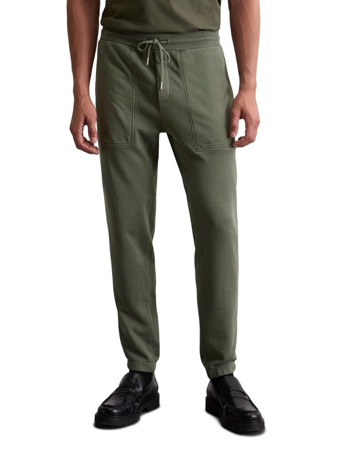 Свободный, современный, экологичный: спортивные брюки из легкой махровой ткани с добавлением переработанного хлопка. Классический крой с эластичным поясом и шнурком с металлическими наконечниками для оптимальной посадки. Большие внешние боковые карманы и накладной карман сзади добавляют непринужденный акцент. Разделительный шов на уровне колена и зауженные штанины с отстроченным краем придают силуэту динамичность. Идеально подходят для непринужденных повседневных образов.