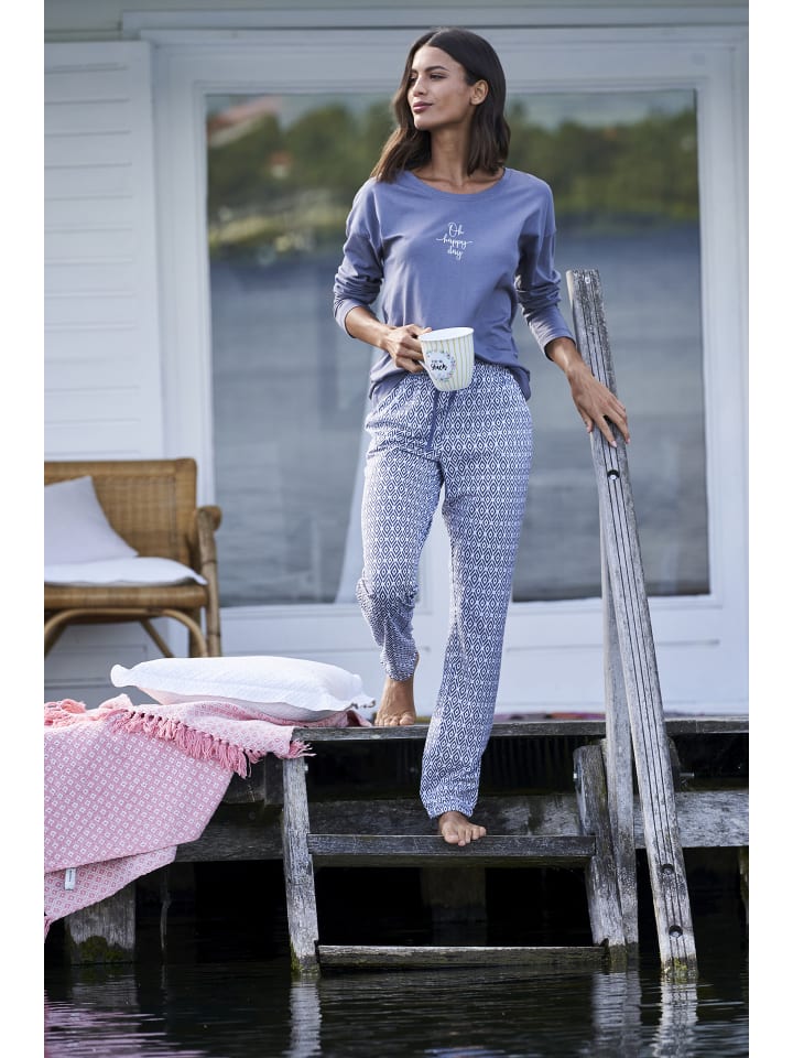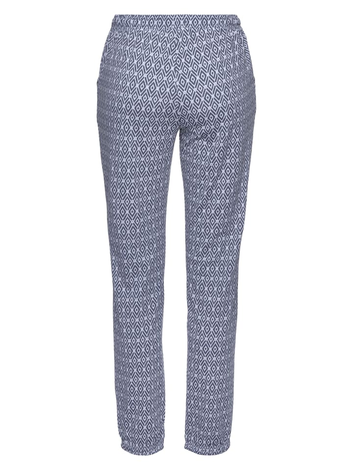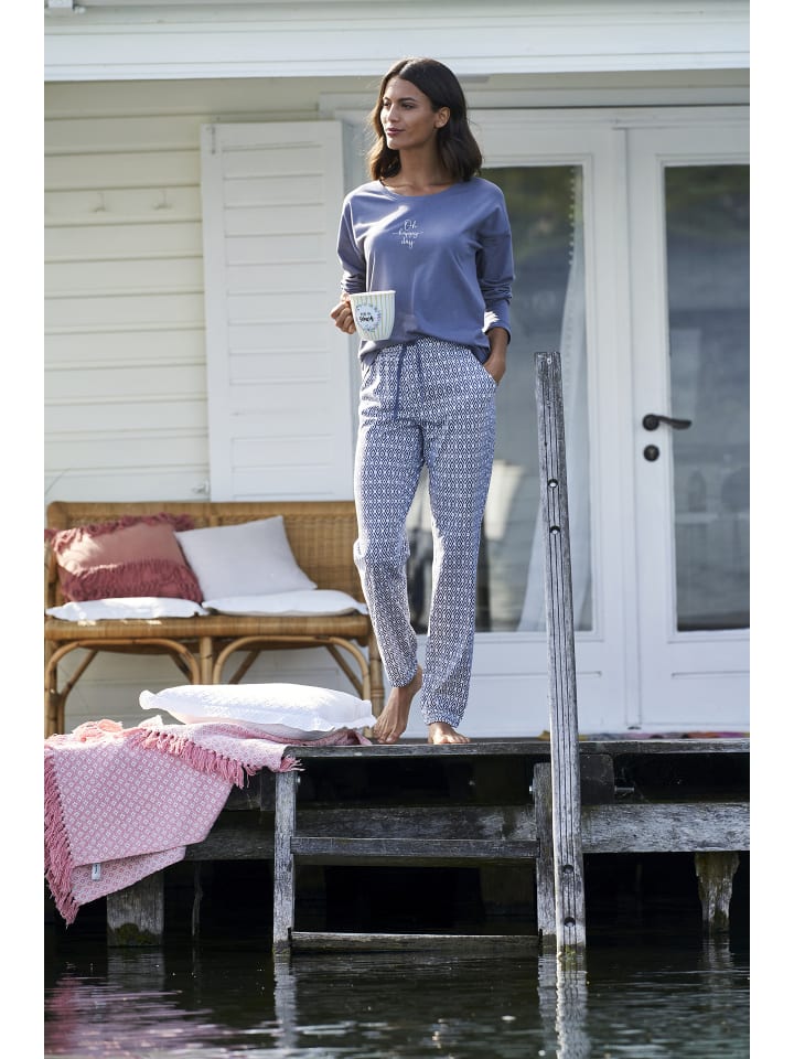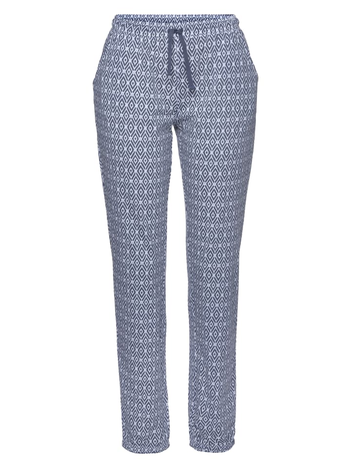 Длинные пижамные штаны от Vivance Dreams. Приталенный крой с принтом по всей поверхности. Удобная посадка благодаря эластичному поясу на шнурке, практичным боковым карманам и эластичным манжетам на брючинах. Универсальный и легко комбинируемый. Мягкий трикотажный материал из 50% хлопка и 50% вискозы.